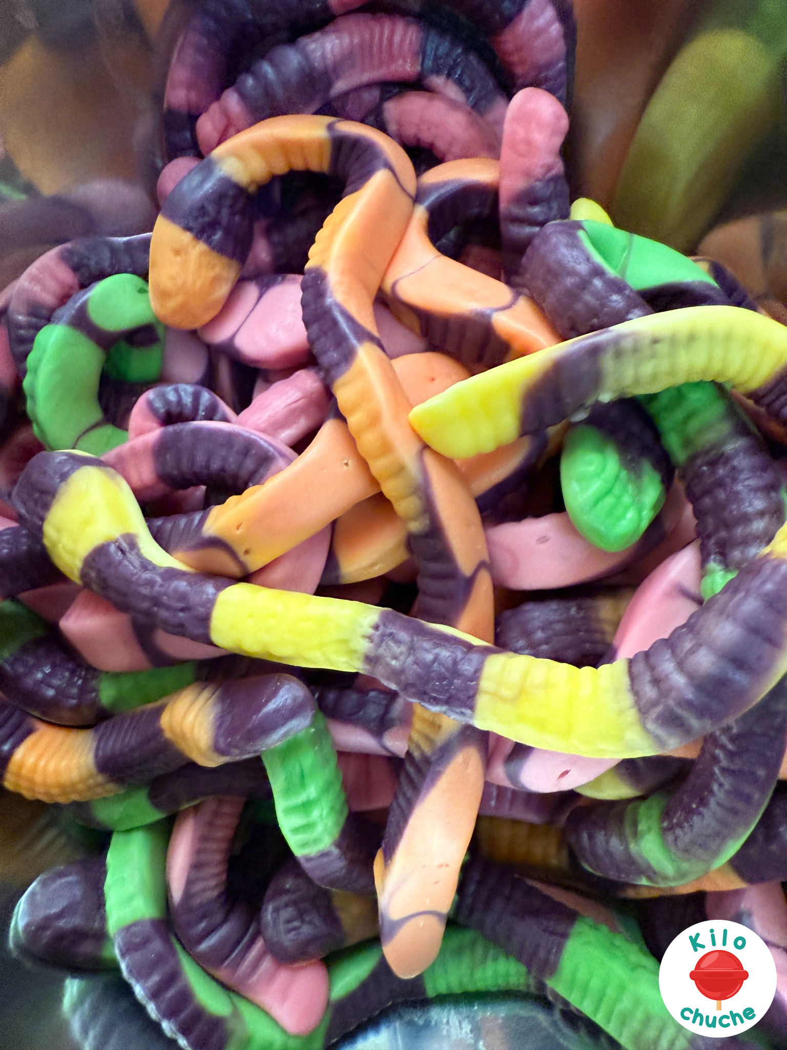 Ingredientes: Azúcar, jarabe de glucosa, jarabe de azúcar invertido, gelatina, gelificante: pectina; almidón, almidón modificado, maltodextrinas, dextrosa, acidulante: ácido cítrico, ácido tartárico, ácido láctico, ácido málico, ácido acético; proteína hidrolizada de arroz, proteína de patata, humectante: glicerina, sorbitoles; zumo de manzana a partir de concentrado; corrector de acidez: citratos de sodio, malatos de sodio; agente de recubrimiento: cera carnauba, cera de abejas; concentrado vegetal: limón, cártamo, zanahoria, grosella negra, rábano, calabaza, manzana, tomate, boniato, cereza, espirulina, hibisco, saúco; aceite de oliva; aromas y colorantes: E100, E120, E133, E160a, E160c. Puede contener trazas de leche.