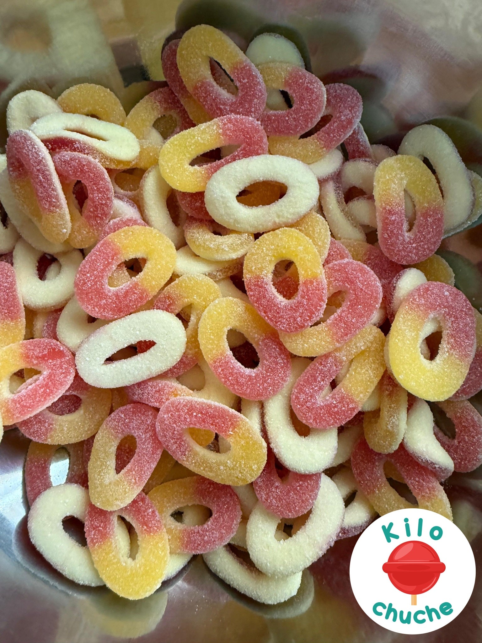 Ingredientes: Jarabe de glucosa; azúcar; gelatina; acidulantes: ácido cítrico, ácido láctico; humectante: sorbitol; alimentos colorantes (bayas de saúco, limón, cúrcuma, cártamo), aroma; zumo concentrado de melocotón.