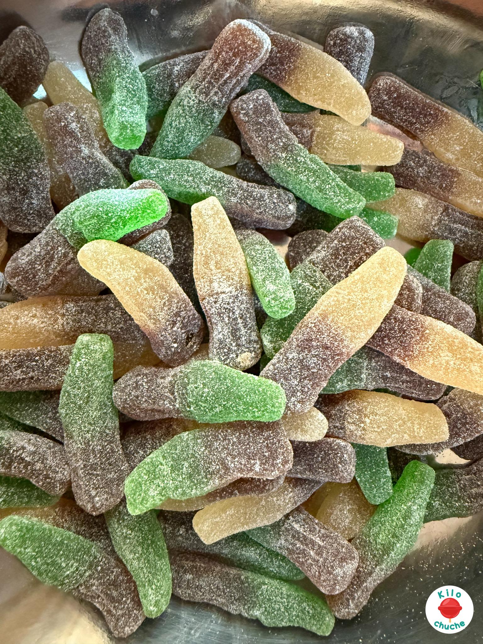 Ingredientes: Jarabe de glucosa, azúcar, agua, almidón modificado de patata, gelatina, acidulantes E330 E296 E270, aromas, colorantes E102 E133 E150c.