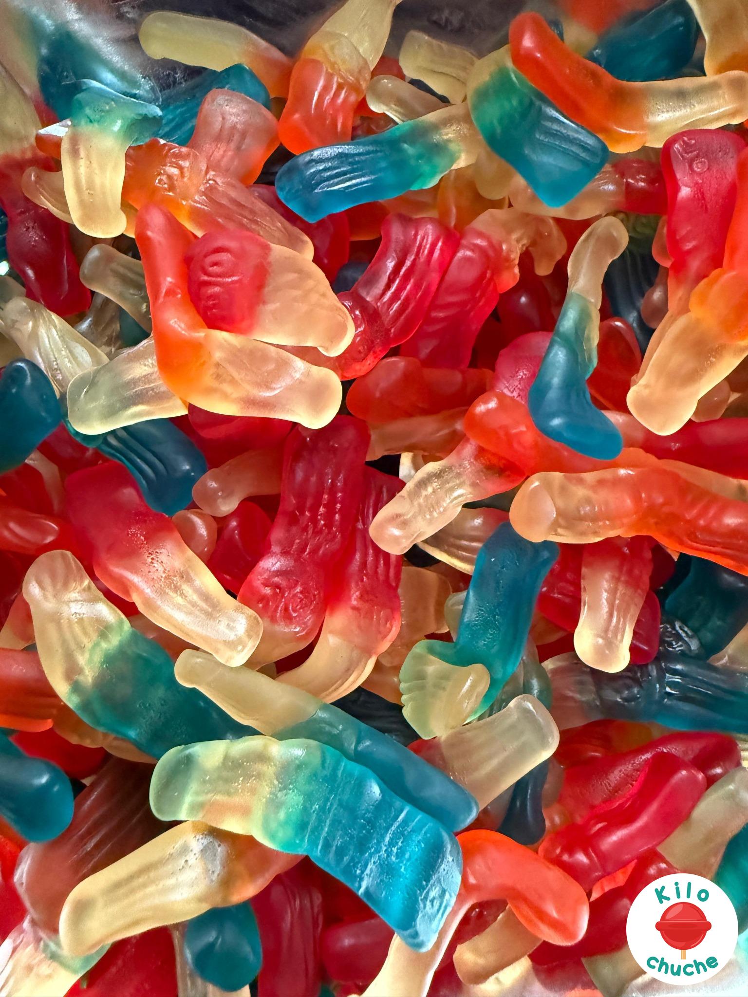 Ingredientes: Jarabe de glucosa, azúcar, agua, gelatina, acidulantes: E330, E296, E270, gelificante: pectina, aromas, colorantes: E102, E129, E133, E516. Aceite vegetal (palma), agente de recubrimiento: cera de carnauba. Halal.