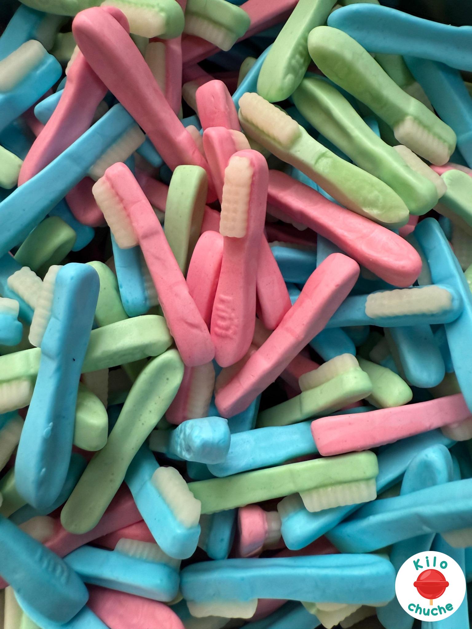 Ingredientes: azúcar, Jarabe de glucosa, agua, gelatina, dextrosa, humectante (E420), acidulantes (E330, E270), corrector de acidez (E325), aromas, agentes de recubrimiento (E901, E903), colorantes (E100 E120 E133). Producido en una fábrica que también maneja derivados lácteos.