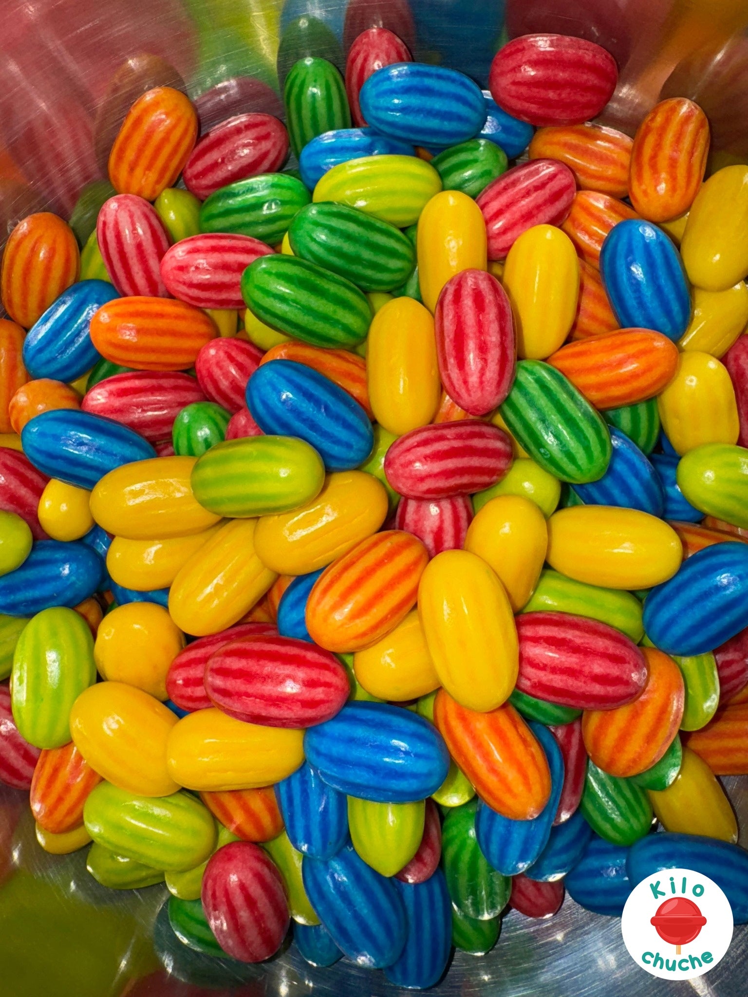 Ingredientes: Azúcar, jarabe de glucosa, goma base, acidulante: E296, aroma, emulgente: lecitina de SOJA, humectantes: E420, E422, antiadherente: E553b, espesante: E414, colorante: E100, E120, E133, E150d. Agentes de recubrimiento: E901, E904, E903.