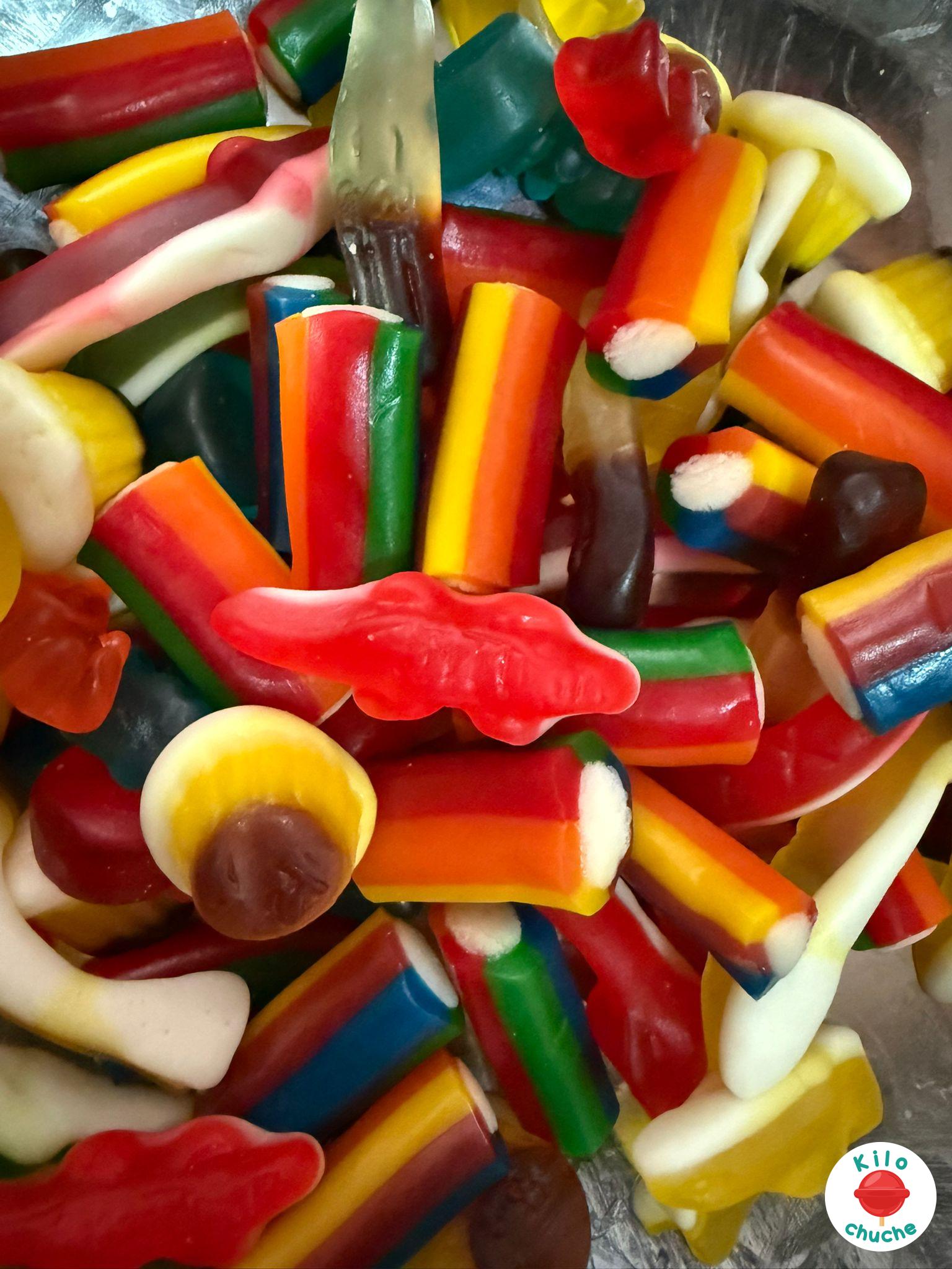 Ingredientes: Jarabe de glucosa, azúcar, agua, almidón modificado de patata, gelatina, acidulantes: E330, E296, E270, aromas, colorantes: E100, E102, E120, E129, E133, E150c, E150d, E341, E516, aceite vegetal (palma), agentes de recubrimiento: cera de carnauba. Halal.