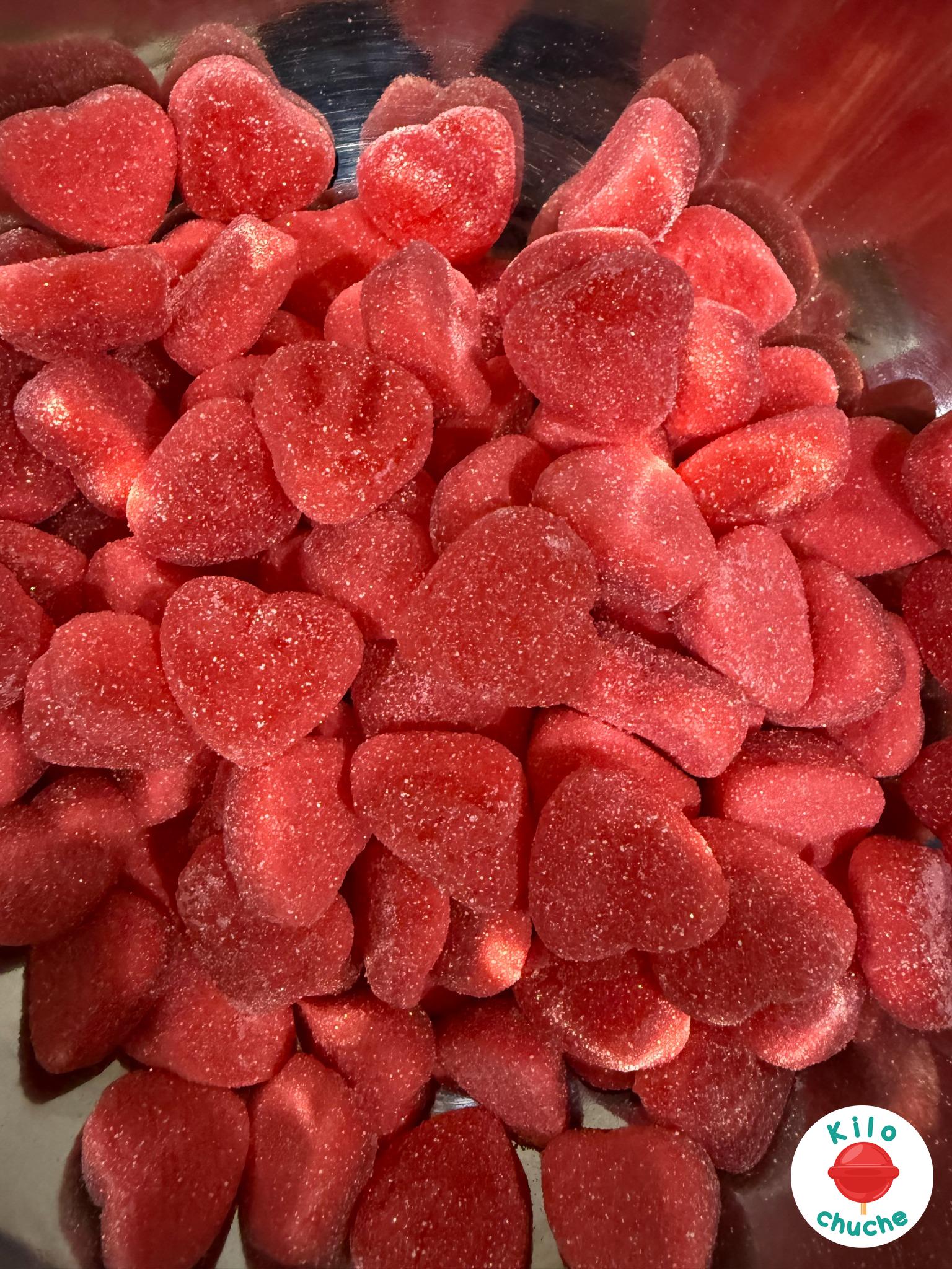 Ingredientes: Azúcar, jarabe de glucosa, agua, almidón modificado de patata, gelatina, acidulantes E330 E296 E270, aromas, almidón de maíz, colorante E120 E129 E160a. Halal.