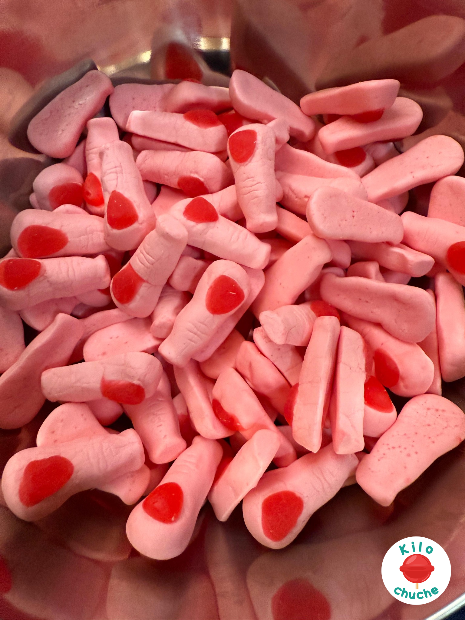 Ingredientes: azúcar, jarabe de glucosa, agua, gelatina, acidulante, ácido cítrico, aromas, humectante glicerina, agente de recubrimiento, cera carnauba, cera de abejas, gelificante pectinas, colorantes E129.