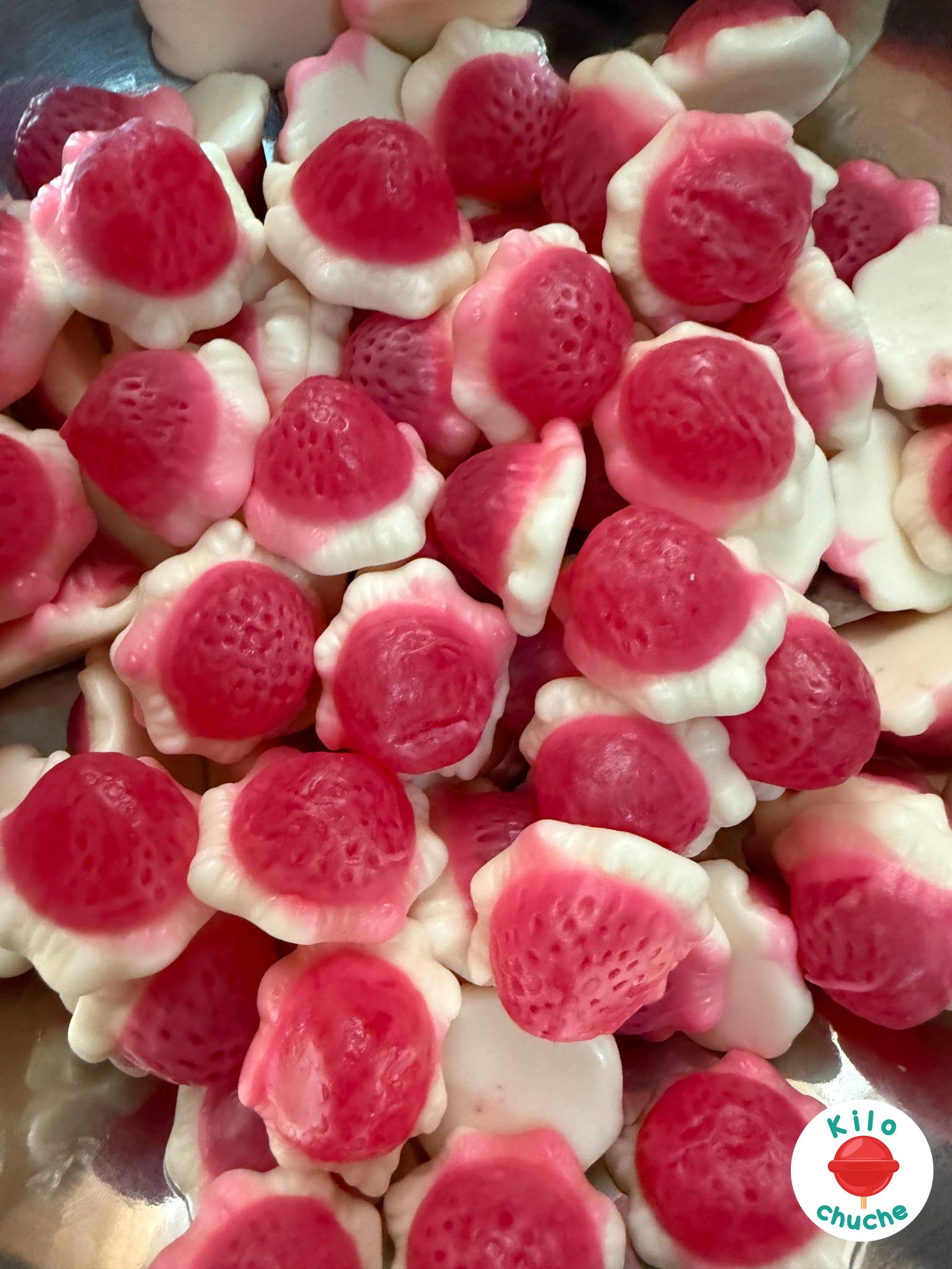 Ingredientes: Jarabe de glucosa, azúcar, agua, gelatina, humectante (E420), gelificante (almidón acetilado), acidulante (E330), gelificante (pectina), acidulante (E270), corrector de acidez (E325), aromas, agentes de recubrimiento (E901, E903), colorante: E122. Puede contener derivados de lácteos.