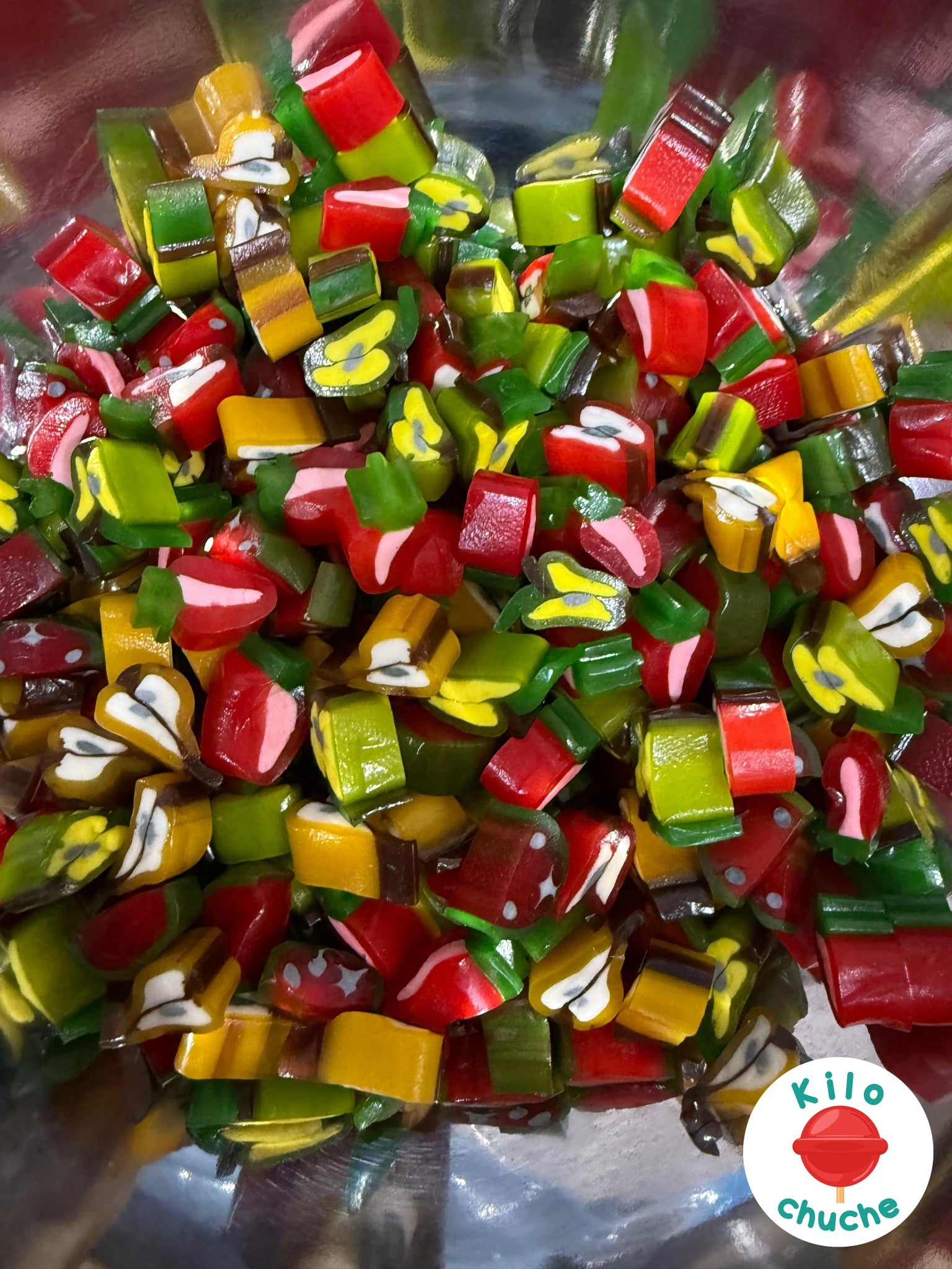 Ingredientes: jarabe de glucosa y fructosa, harina de trigo, azúcar, almidón, extracto de regaliz, grasa vegetal: palma, coco, humectante: E422, emulgente E471, colorantes: E102, E129, E133 ,E150d, E171. Puede contener trazas de lácteos.