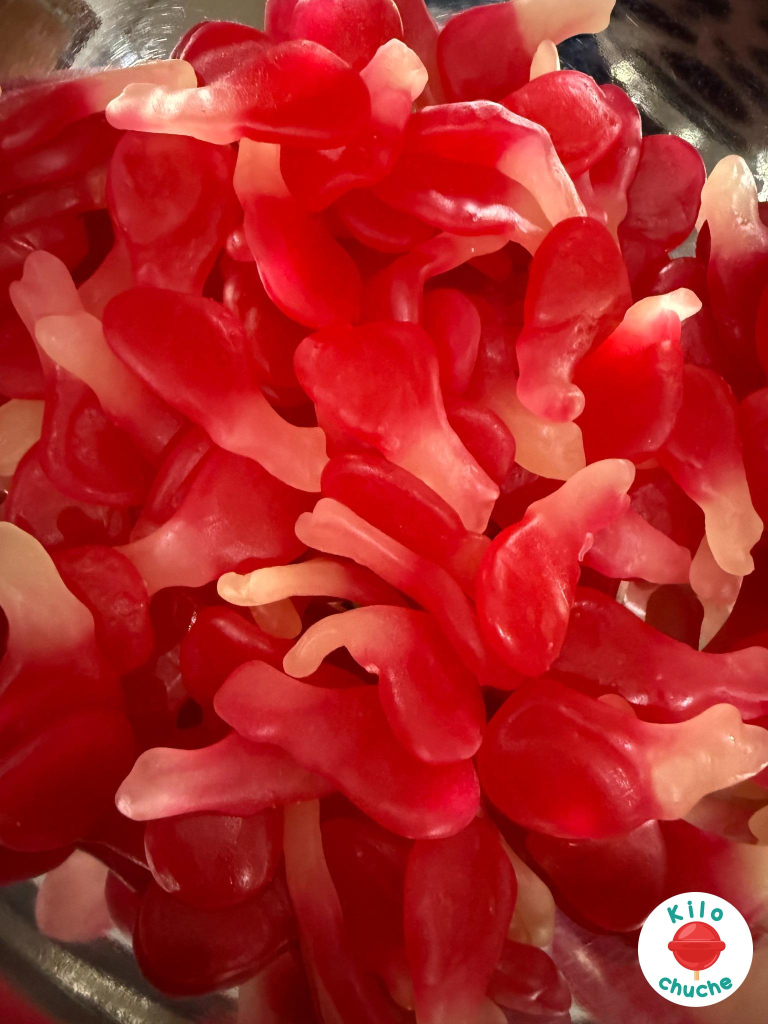 Ingredientes: Jarabe de glucosa, azúcar, almidón, agua, gelatina bovina halal, acidulante: ácido cítrico (E330), aroma, aceite vegetal (palmiste), agente de recubrimiento cera de carnauba (E903), colorante (E122). Halal Beef Gelatine.