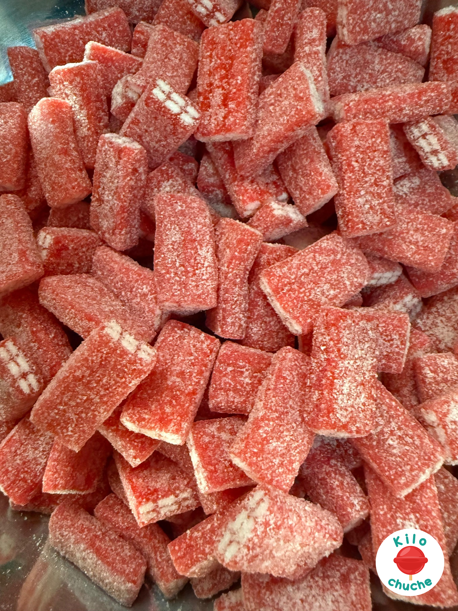 Ingredientes: Jarabe de glucosa y fructosa, azúcar, harina de trigo (gluten), almidón, acidulante (E296), grasa vegetal (palma), acidulantes (E330, E270), correctores de acidez (E325, E331), sal, emulgente (E471), aromas, humectante (E422), colorantes y/o concentrados: E129.