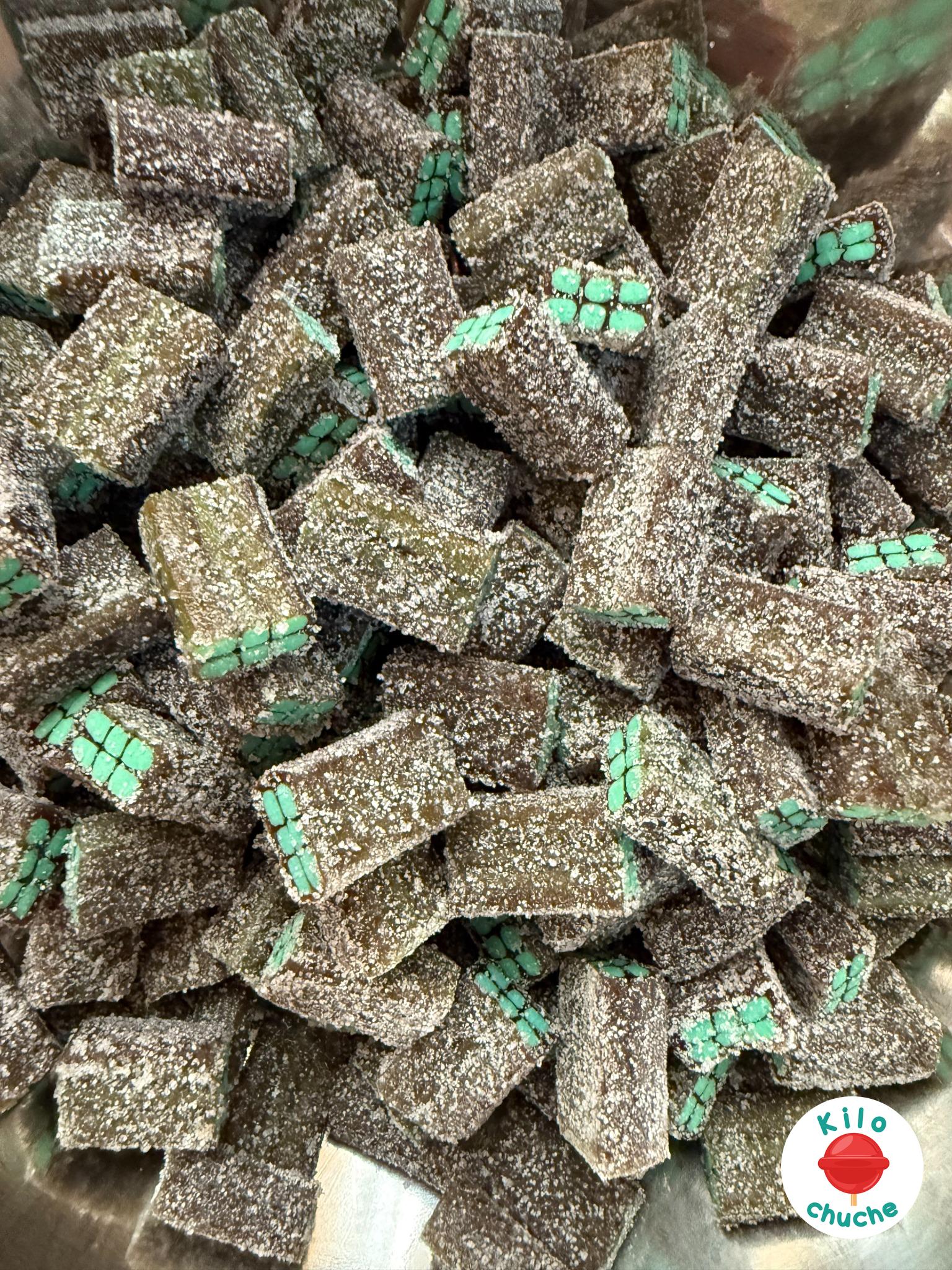 Ingredientes: Azúcar, jarabe de glucosa-fructosa, agua, almidón de maíz, harina de TRIGO, dextrosa, humectante: E420ii, acidulantes: E296, E330, gelatina, grasa de palma, corrector de acidez: E331iii, emulgente: E471, aromas, colorante: E100, E133, E150d.