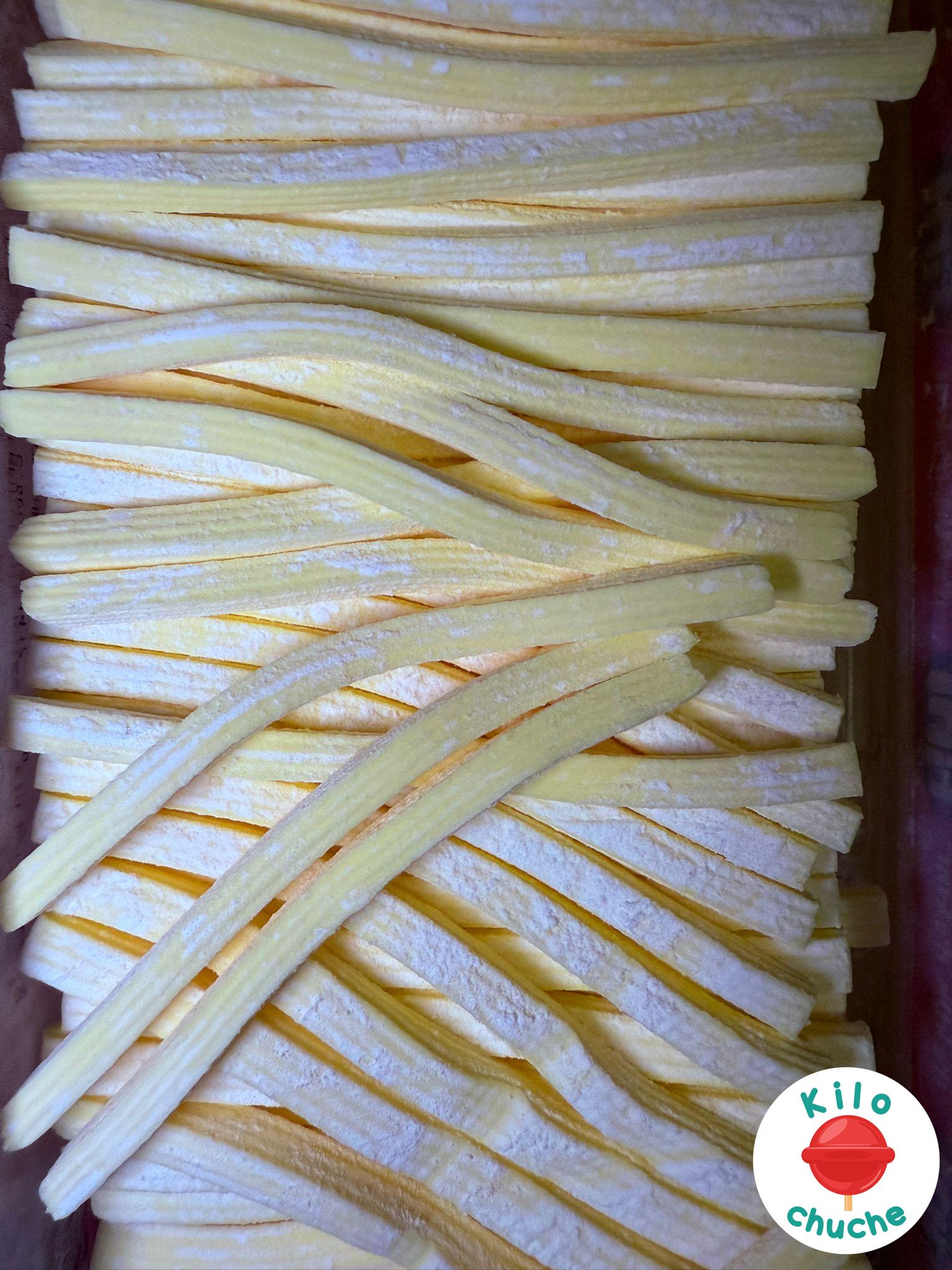 Ingredientes: Azúcar, jarabe de glucosa y fructosa, grasa de palma, jarabe de azúcar invertido, almidón de patata; humectante: glicerina; acidulante: ácido tartárico; gelatina, aromas; concentrado vegetal: cártamo, limón; harina de trigo (contiene gluten), colorantes: E100. Puede contener trazas de leche.
