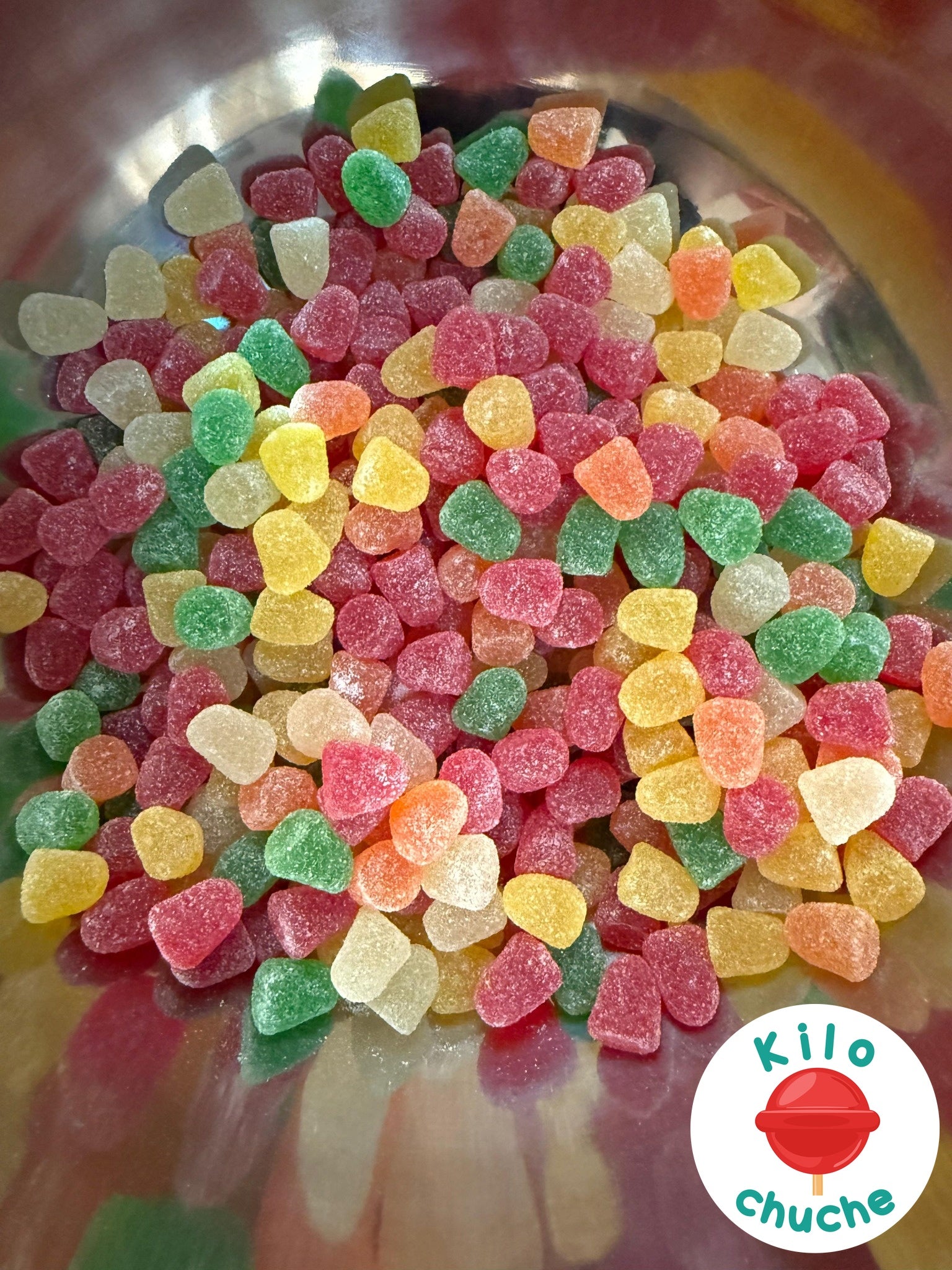 Ingredientes: Jarabe de glucosa, azúcar, agua, almidón modificado de pata, gelatina, acidulante E330 E296 E270, aromas, colorantes E102 E129 E133. Halal.