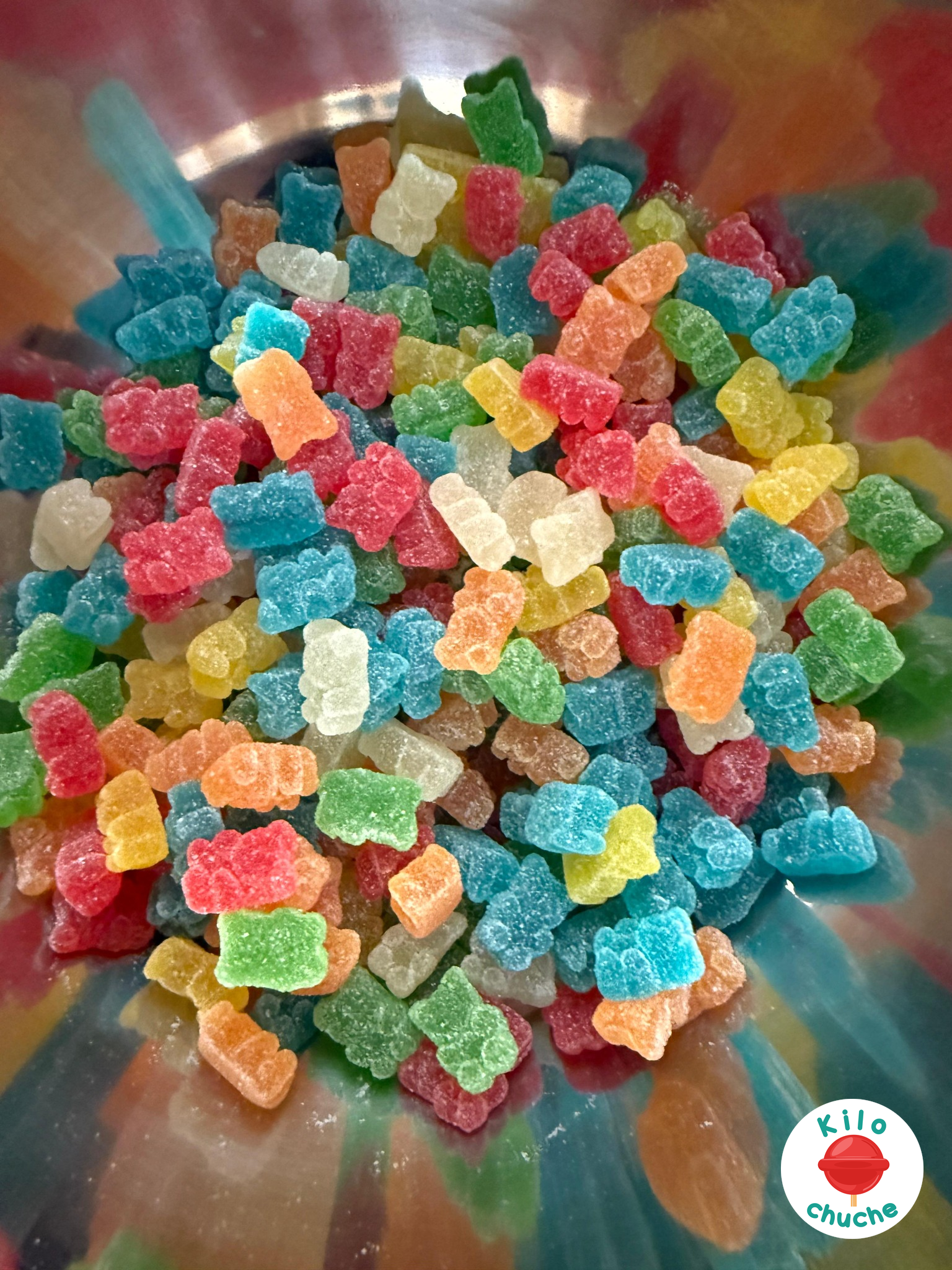 Ingredientes: Jarabe de glucosa, azúcar, agua, almidón modificado de patata, gelatina, acidulante: E330, E296, E270, aromas, colorantes: E102, E129, E133. Halal.