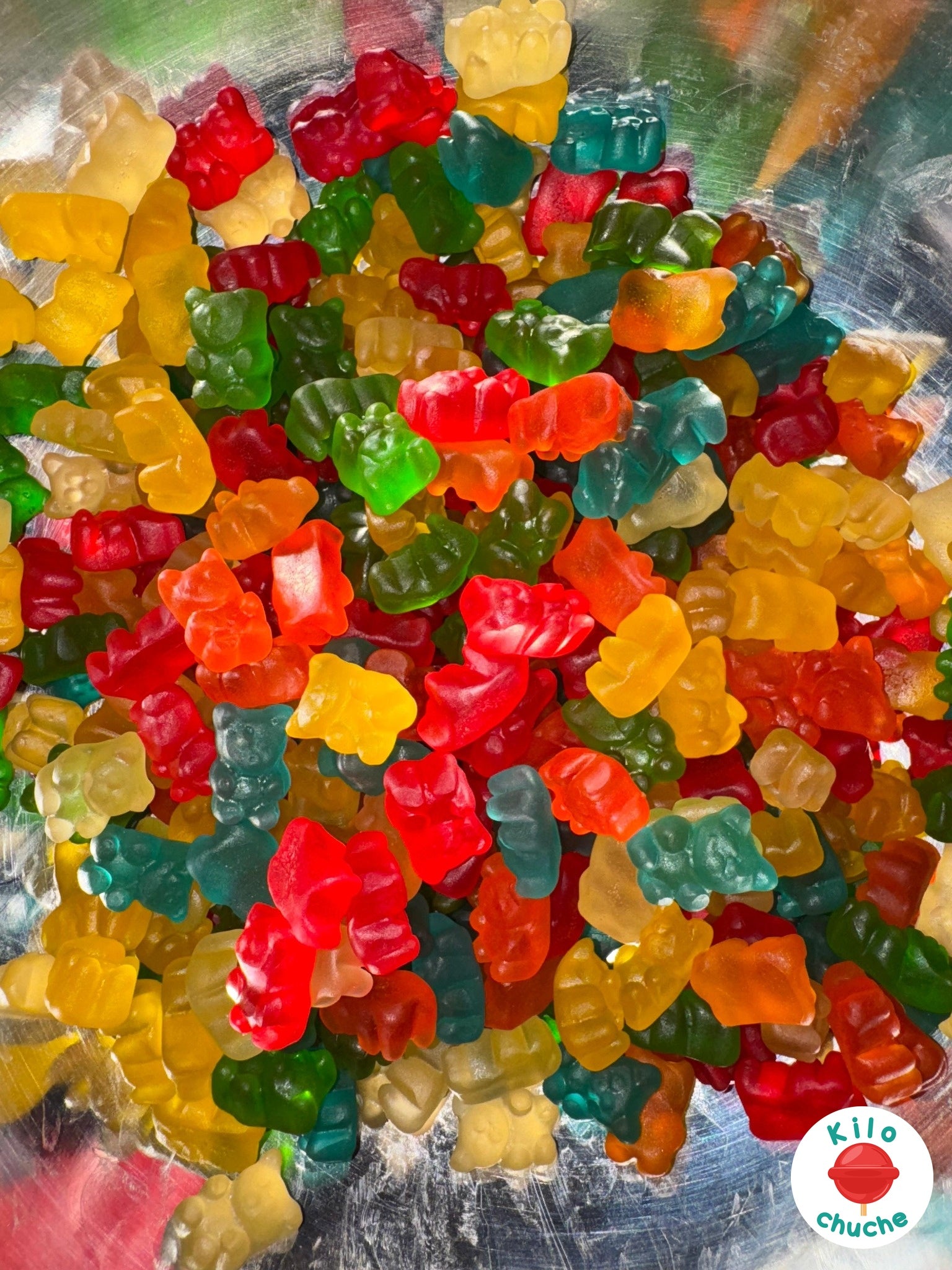 Ingredientes: Jarabe de glucosa, azúcar, agua, almidón modificado de patata, gelatina, acidulantes: E330, E296, E270, aromas, colorantes: E102, E129, E133, aceite vegetal (palma), agente de recubrimiento: cera de carnauba. Halal.