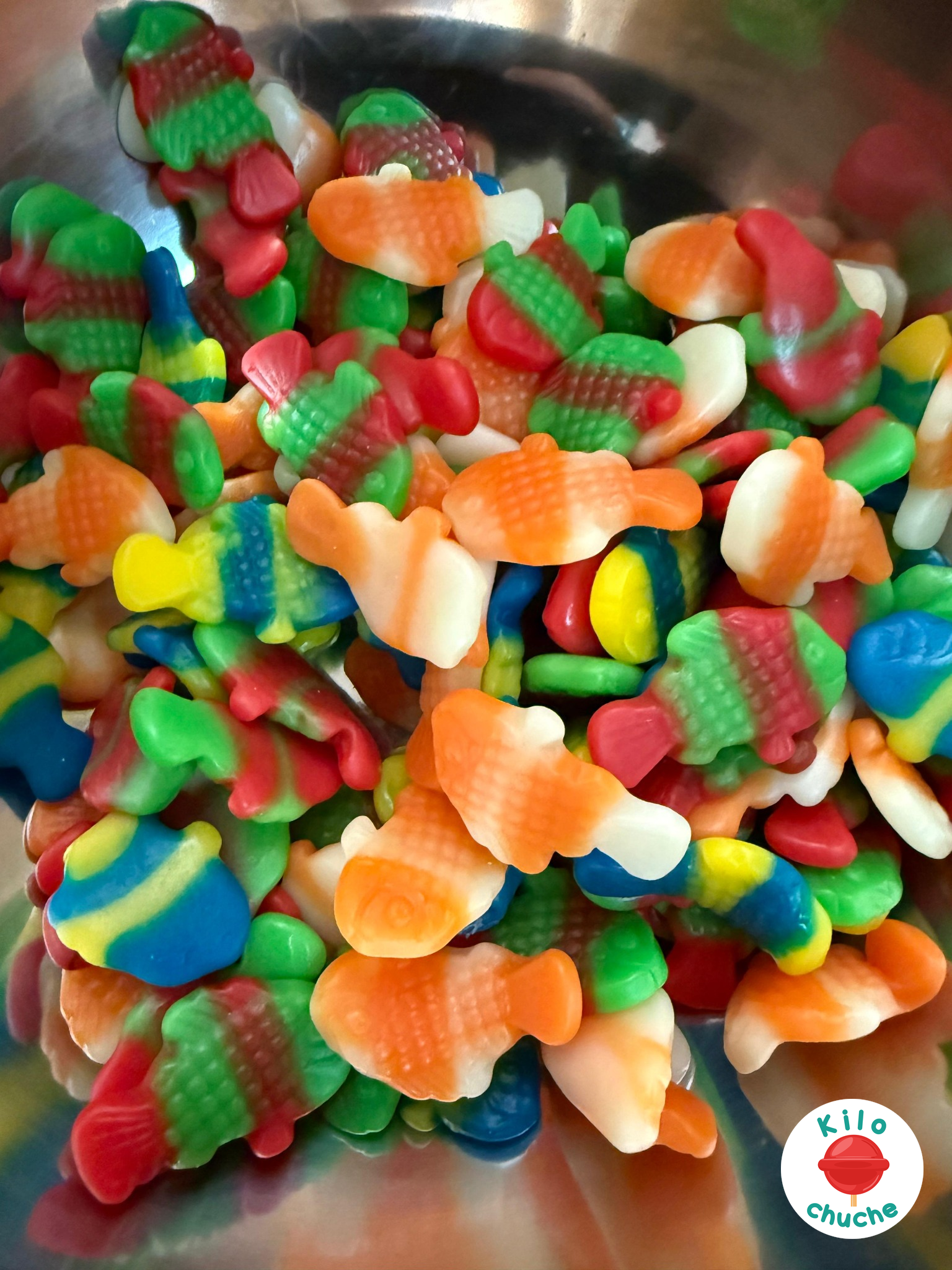 Ingredientes: jarabe de glucosa; azúcar; humectante: jarabe de sorbitol; almidón de maíz; agua; gelatina; acidulante: ácido cítrico; aroma; colorantes: tartrazina, rojo allura AC, azul patente V, azul brillante FCF; agentes de recubrimiento: cera de abeja, blanca y amarilla, cera de carnauba. Puede contener trazas de leche, trigo