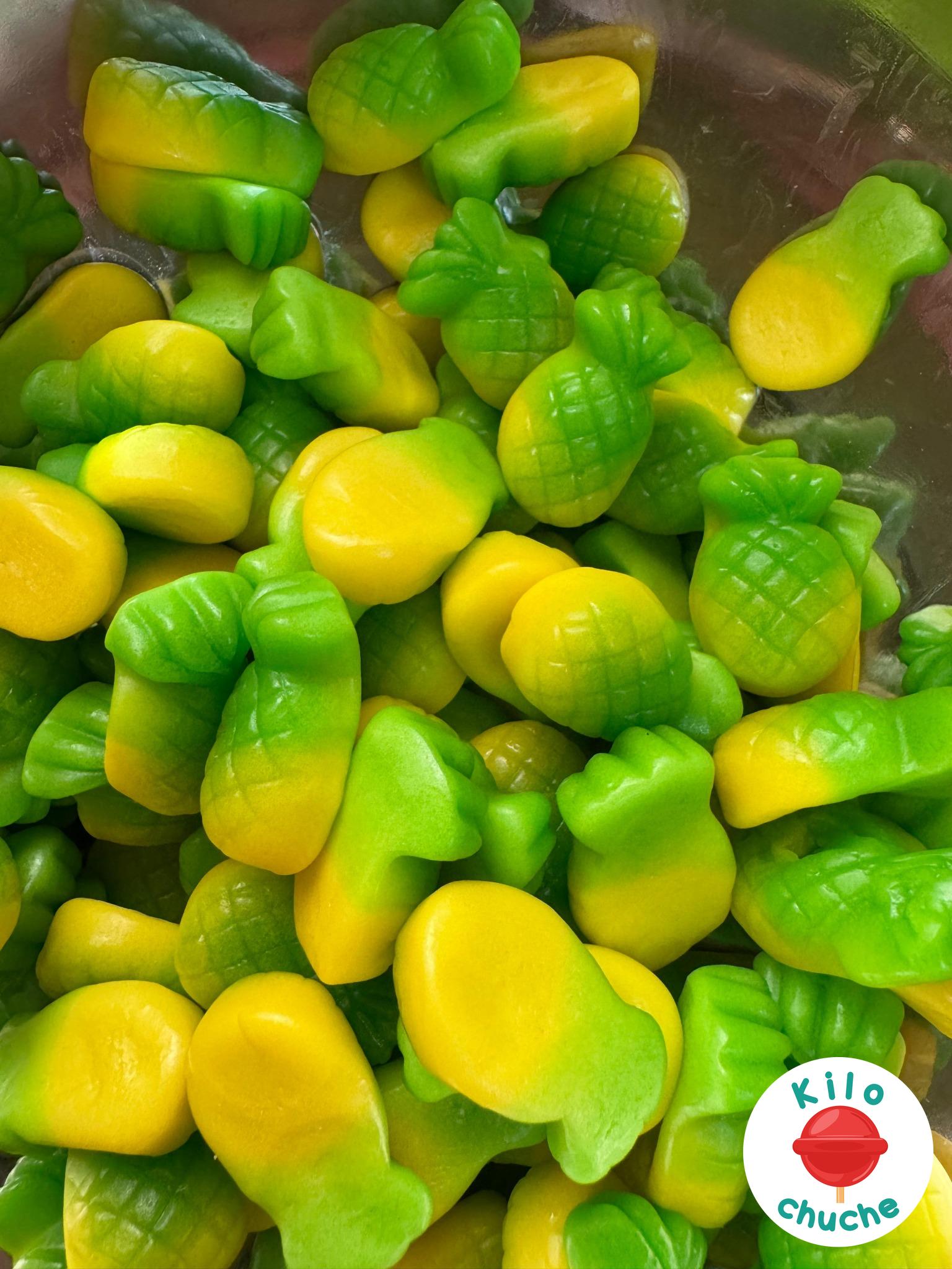 Ingredientes: Jarabe de glucosa, azúcar, agua, almidón modificado de patata, gelatina, acidulantes: E330, E296, E270, aromas, colorantes: E102, E129, E133. Aceite vegetal (palma), agente de recubrimiento: cera de carnauba. Halal.