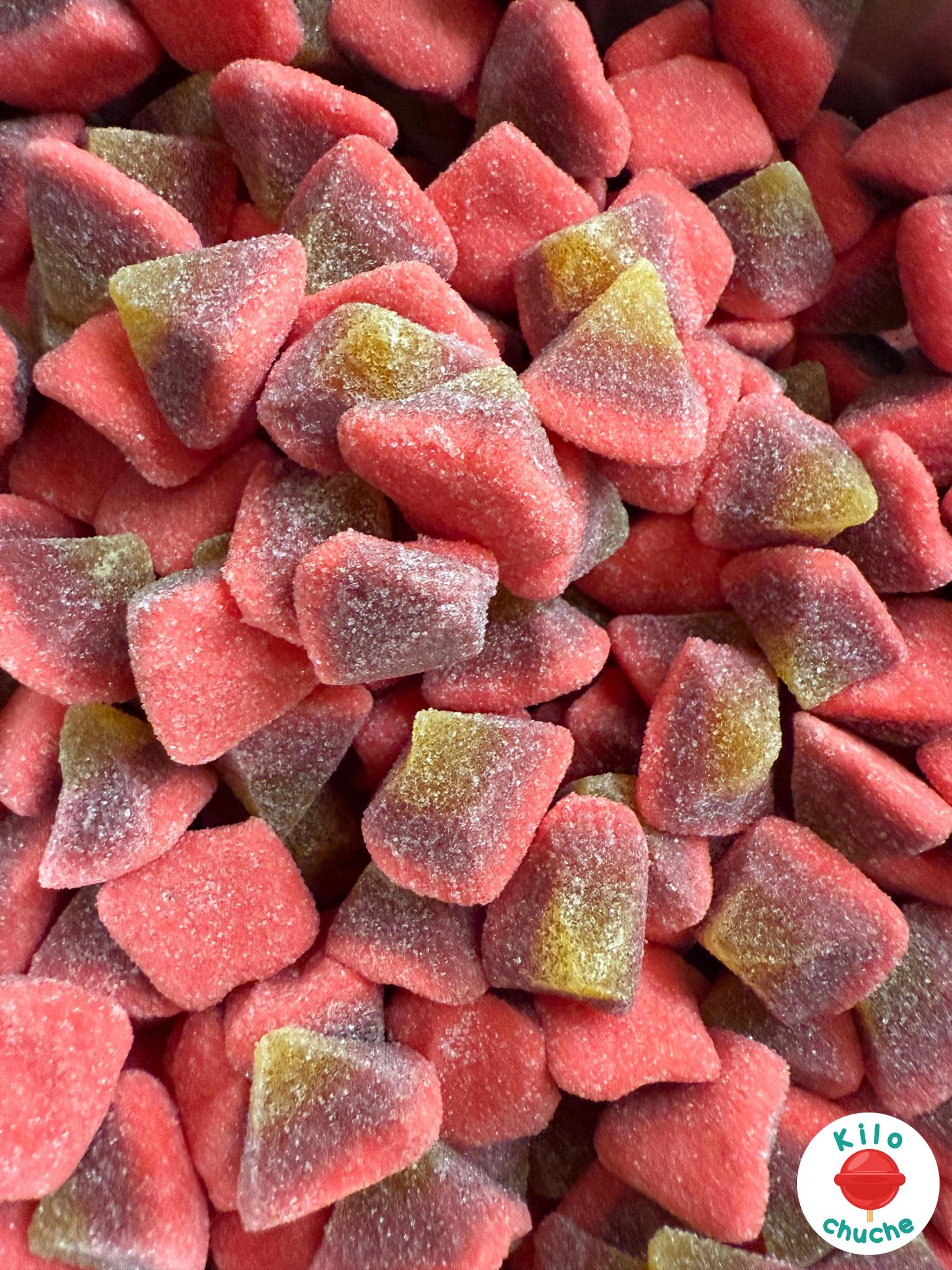 Ingredientes: jarabe de glucosa, azúcar, agua, almidón modificado de patata, gelatina, acidulantes E330, E296, E270, aromas, colorantes E102 E129 E133 E516. Halal.