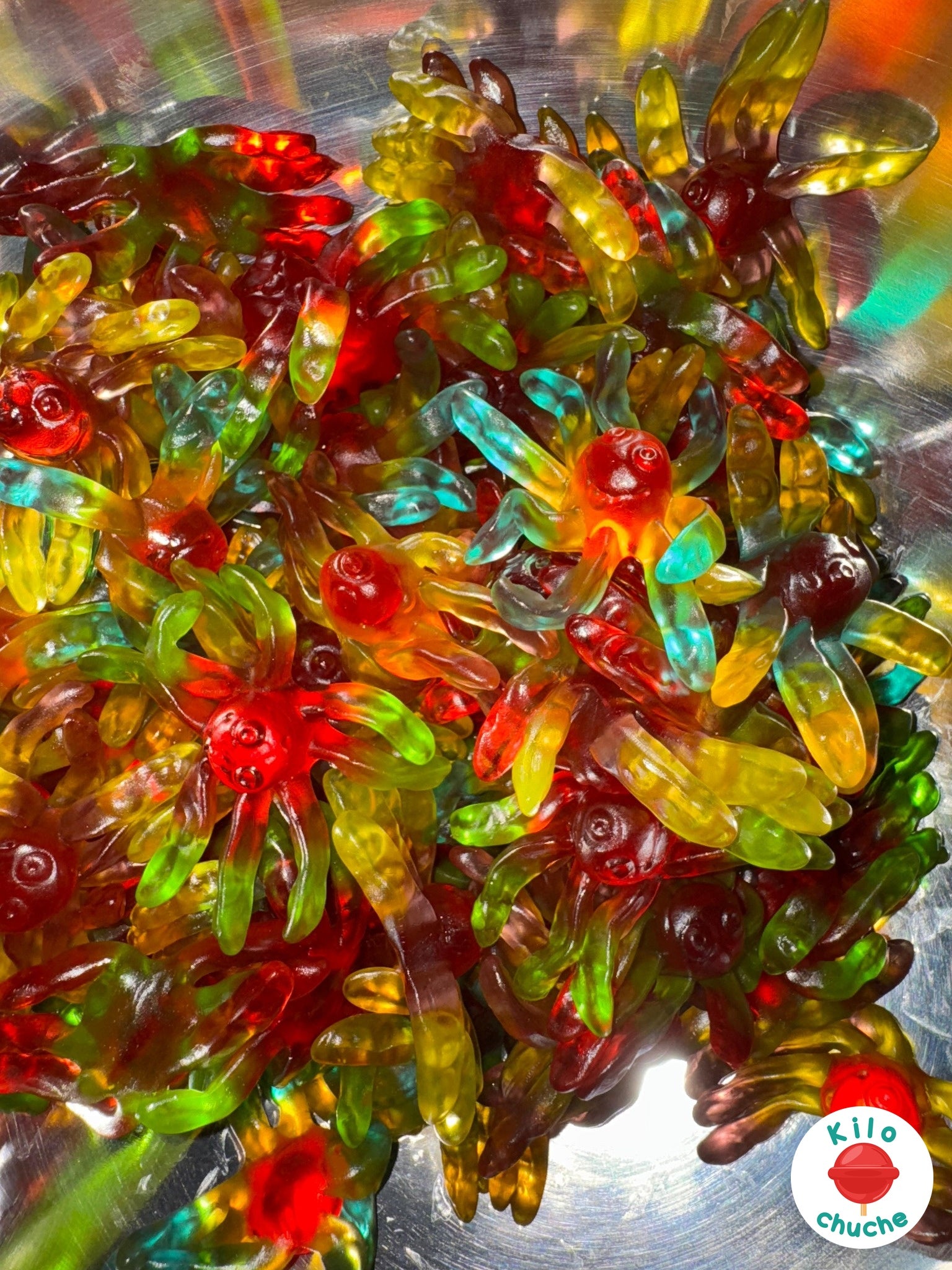 Ingredientes: Jarabe de glucosa, azúcar, gelatina, acidulantes: ácido cítrico, ácido láctico, aroma, colorantes: curcumina, carmín, azul brillante FCF, agentes de recubrimiento: cera de abeja, blanca y amarilla, cera de carnaba. Sin gluten.