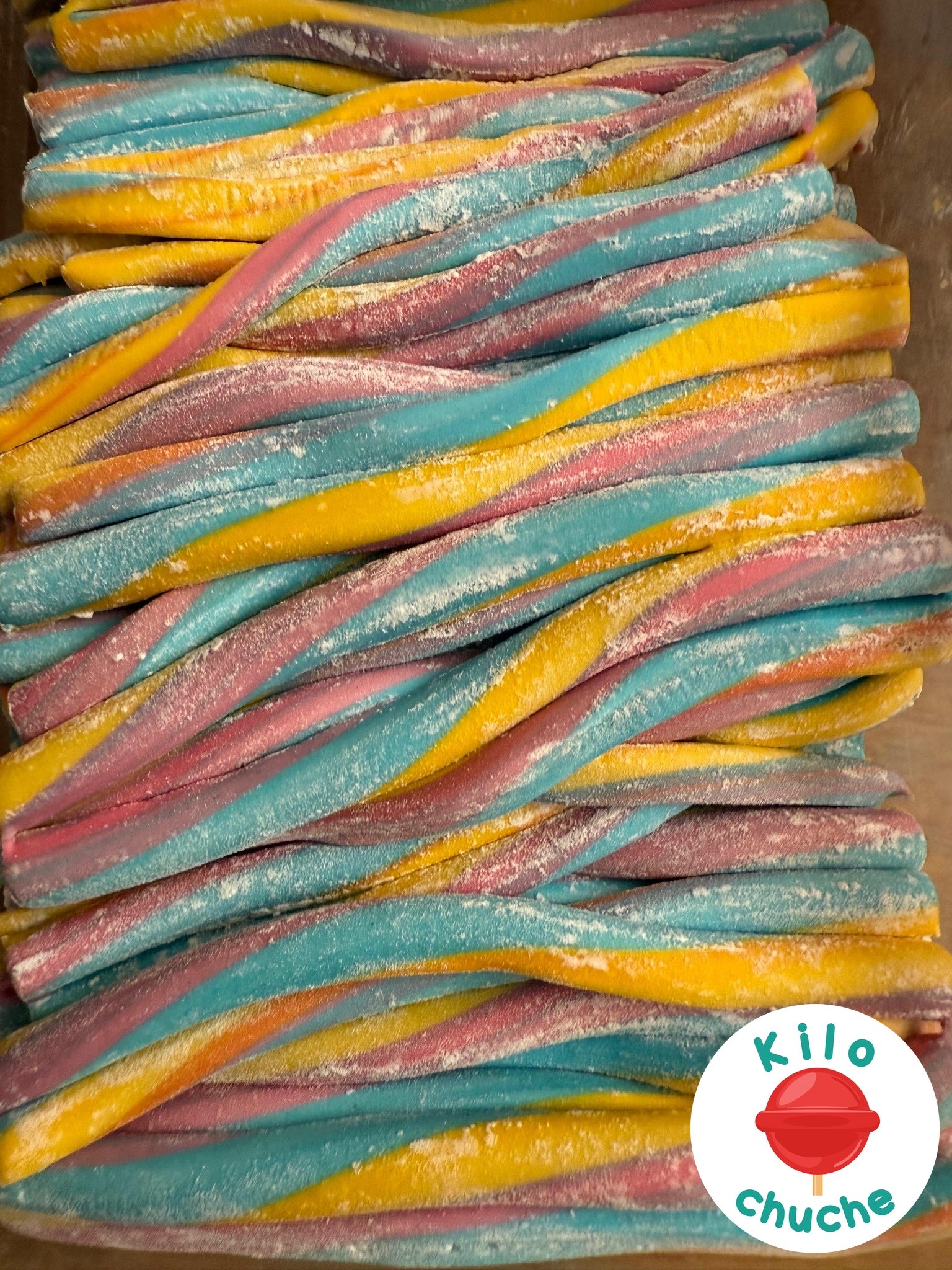 Ingredientes: azúcar, jarabe de glucosa y fructosa, harina de trigo (gluten), grasa vegetal (palma), almidón, humectante E422, acidulantes E330 E296 E270, gelatina, correctores de acidez E325 E331, aromas, sal, emulgente E471, colorantes E100 E120 E133. Puede contener trazas de soja y mostaza.