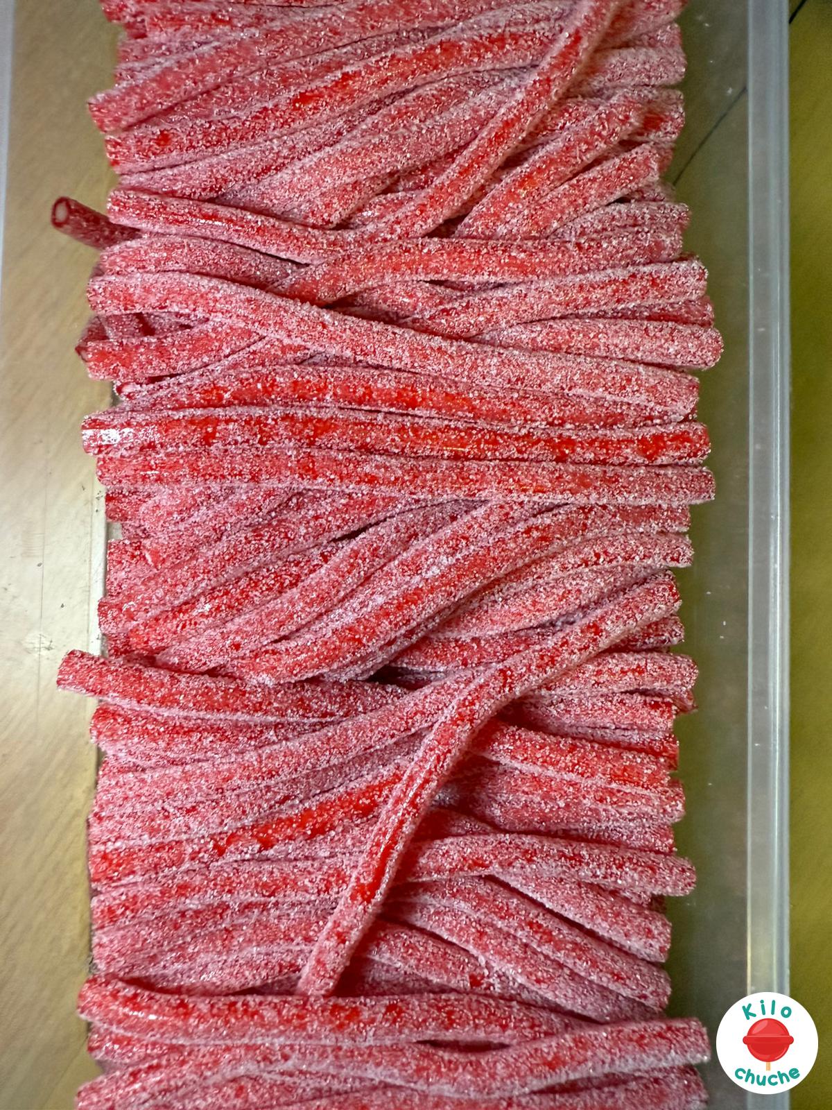 Ingredientes: azúcar, jarabe de gluco-fructosa, harina de TRIGO, agua, acidulantes E330 E296, dextrosa, grasa vegetal coco, correcto de acidez E350, emulgente E471 de aceite de palma, aromas, conservador E202, colorantes E122 E129 E341 E516.