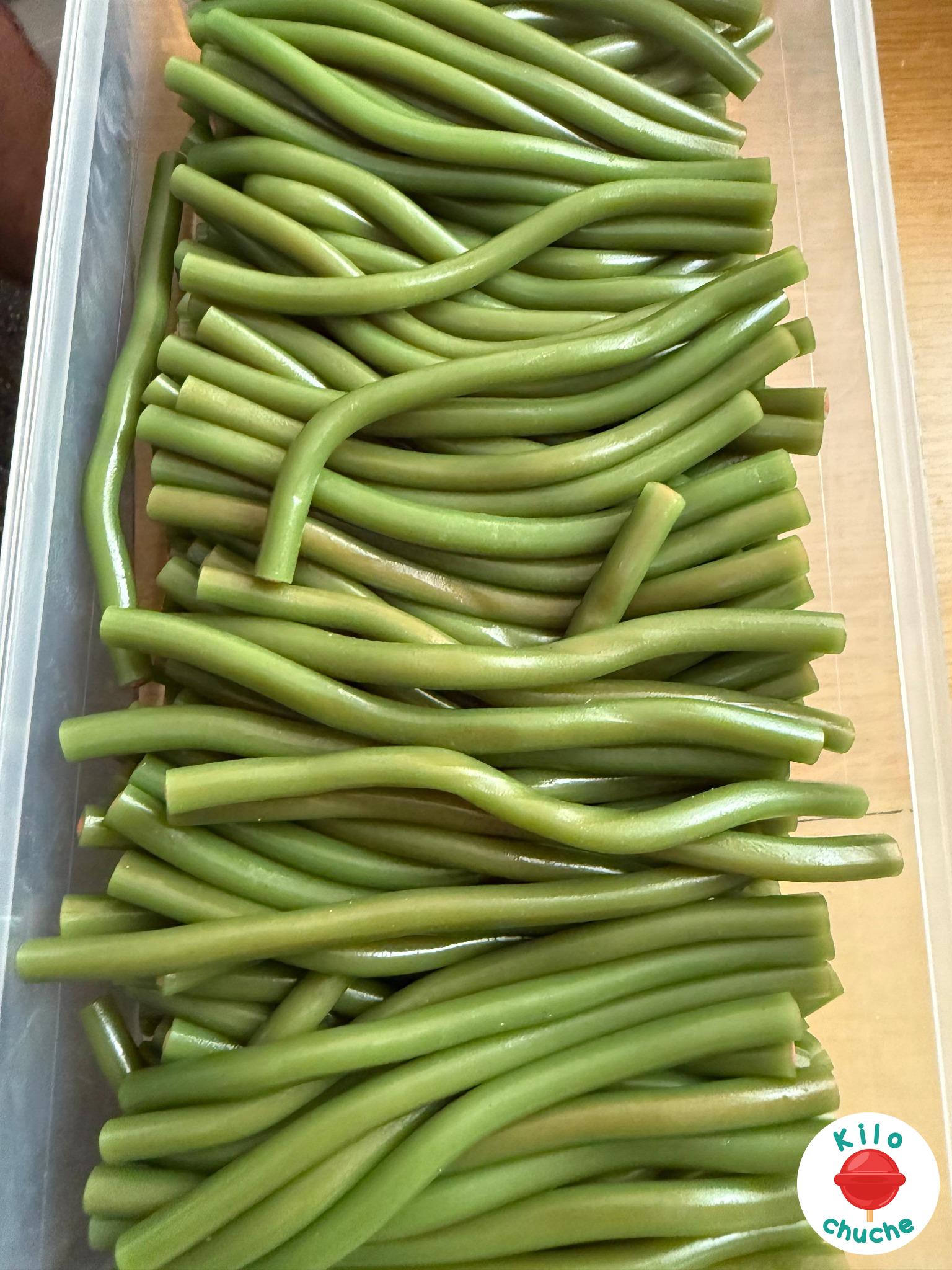 Ingredientes: Azúcar, jarabe de glucosa-fructosa, harina de TRIGO, agua, dextrosa, grasa vegetal (coco), acidulantes: E330, E296, emulgente: E471 (de aceite de palma), aromas, conservador: E202, colorantes: E102, E129, E133, E341. Halal.