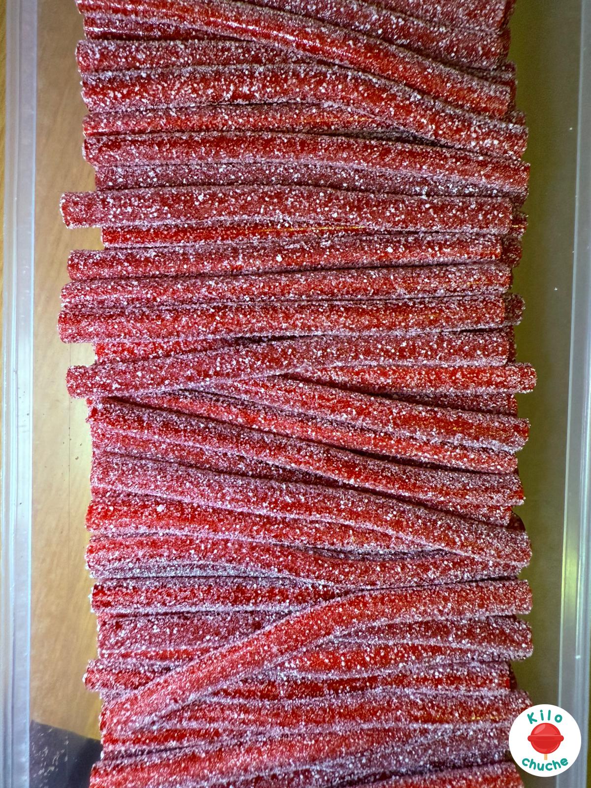 Ingredientes: Azúcar, jarabe de glucosa-fructosa, almidón de maíz, agua, harina de TRIGO, dextrosa, humectante: E420ii, acidulantes: E330, E296, gelatina, grasa de palma, corrector de acidez: E331iii, emulgente: E471, aromas, colorantes: E122, E129, E132.