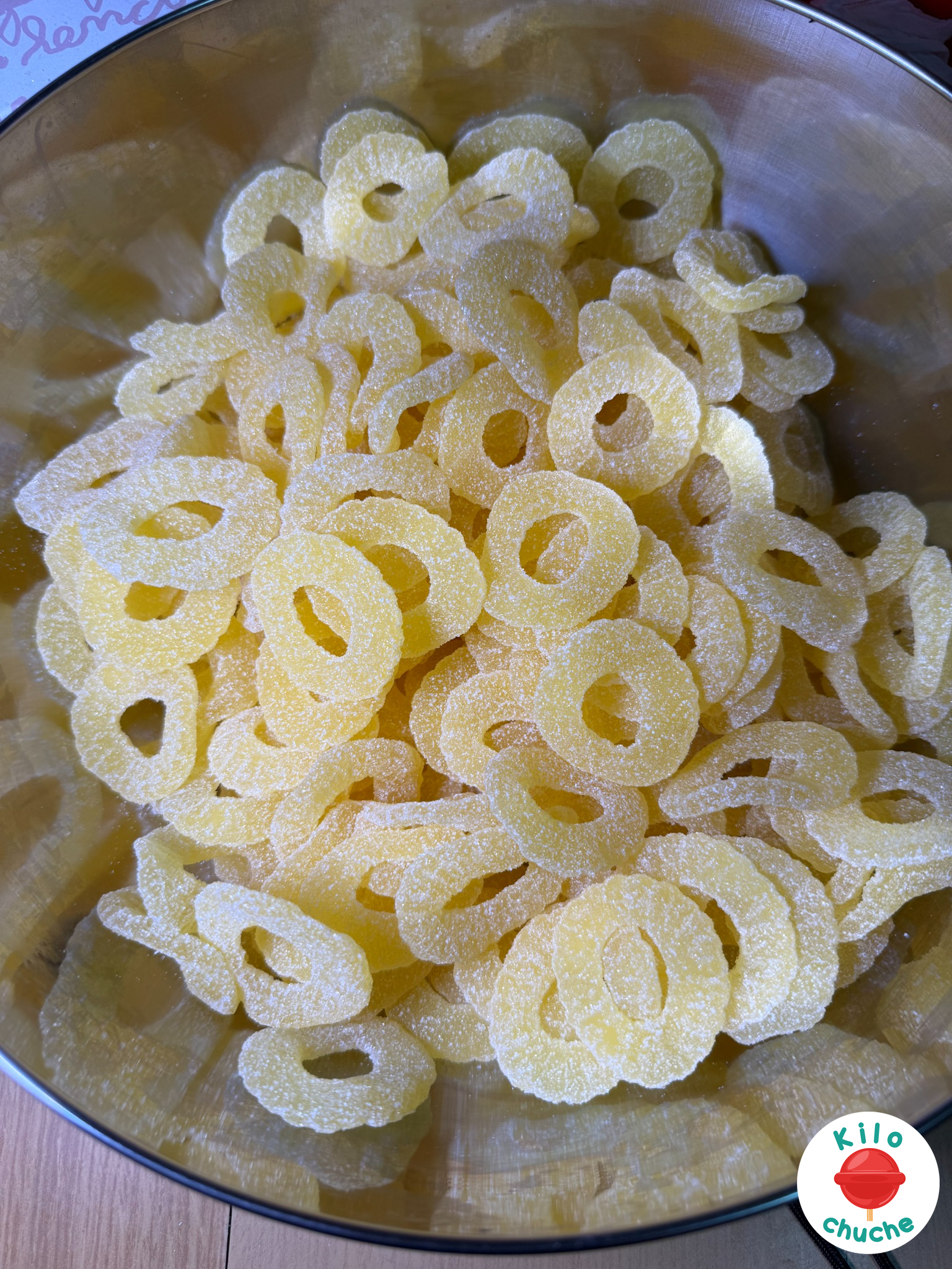 Ingredientes: Azúcar, jarabe de glucosa, jarabe de azúcar invertido, gelatina, gelificante: pectina; almidón de maíz, almidón de maíz, almidón de patata, almidón modificado de patata, almidón modificado de tapioca, maltodextrinas, dextrosa, acidulante: ácido cítrico, ácido tartárico, ácido láctico, ácido málico, ácido acético; proteína hidrolizada de arroz, proteína de patata, humectante: glicerina, sorbitoles; zumo de manzana a partir de concentrado; corrector de acidez: citratos de sodio, malatos de sodio; aceites vegetales (palma, coco, colza, girasol), agente de recubrimiento: cera de carnauba, cera de abejas; concentrado vegetal: limón, cártamo, zanahoria, grosella negra, rábano, calabaza, manzana, tomate, boniato, cereza, espirulina, hibisco, saúco; aceite de oliva; aromas y colorantes: E102. Puede contener trazas de leche.