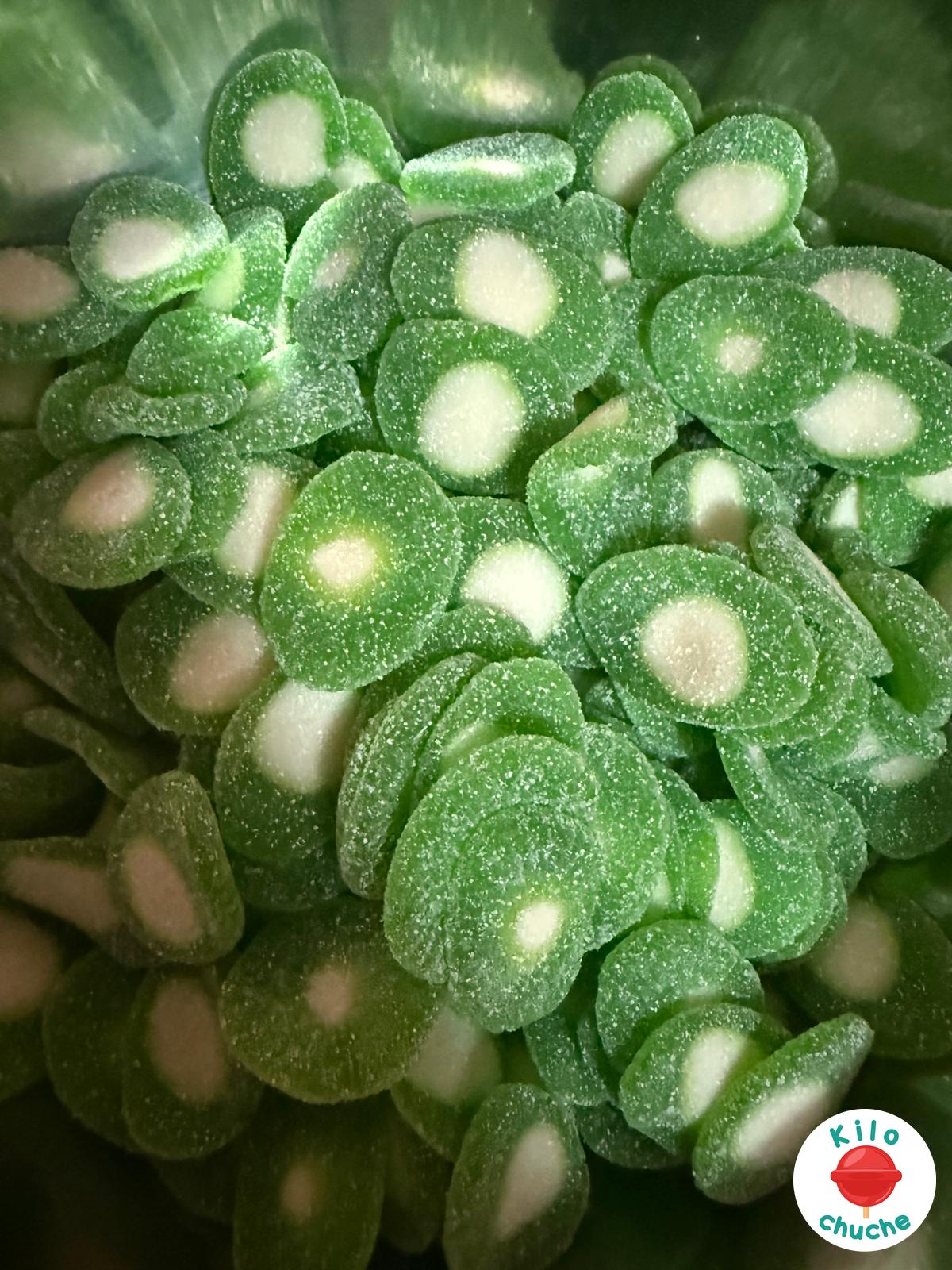 Ingredientes: Jarabe de glucosa, azúcar, gelatina; acidulante: ácido málico, ácido cítrico; Humectante: glicerina; Gelificante: pectinas, aromas ; Colorantes: colorantes, E171, E100 , E133.