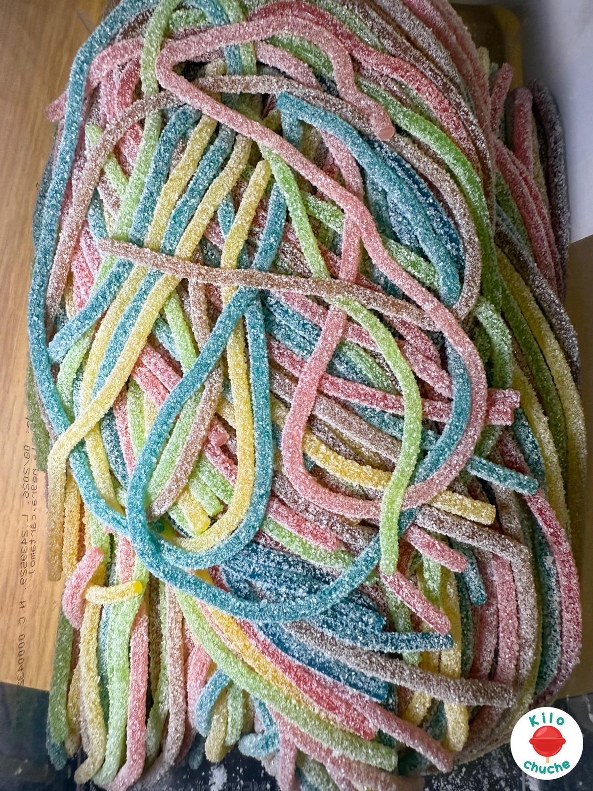 Ingredientes: Jarabe de glucosa y fructosa, azúcar, harina de trigo (gluten), almidón, acidulante (E296), grasa vegetal (palma), acidulantes (E330, E270), correctores de acidez (E325, E331), sal, emulgente (E471), aromas, humectante (E422), concentrados (rábano, manzana, grosella negra), colorantes: E100, E133, E150d, E163.