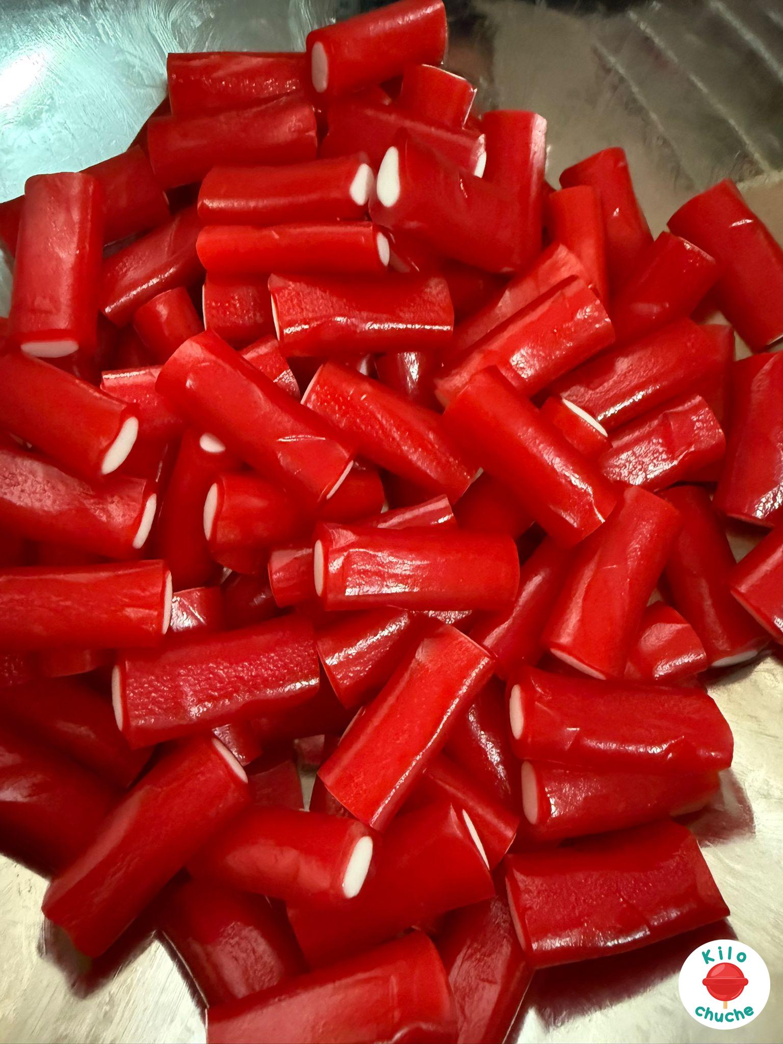 Ingredientes: azúcar, jarabe de glucosa, fructosa, harina de trigo (gluten), almidón, gelatina, grasa vegetal (palma), aceite vegetal (palma y coco), acidulante E270 E296 E330, aromas, correctores de acidez E325 E331, sal, emulgente E471, humectante E422, colorante E129. Puede contener trazas de soja y mostaza. Puede contener lactosa.