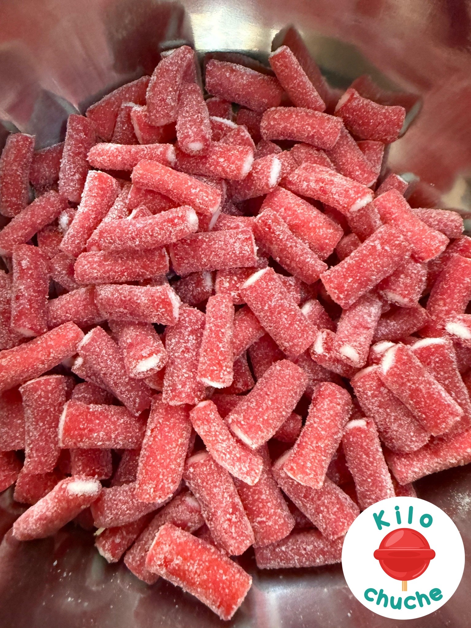 Ingredientes: Jarabe de glucosa y fructosa, azúcar, harina de trigo (gluten), almidón, acidulante (E296), grasa vegetal (palma), acidulantes (E330, E270), correctores de acidez (E325, E331), sal, emulgente (E471), humectante (E422), colorantes y/o concentrados: E129.