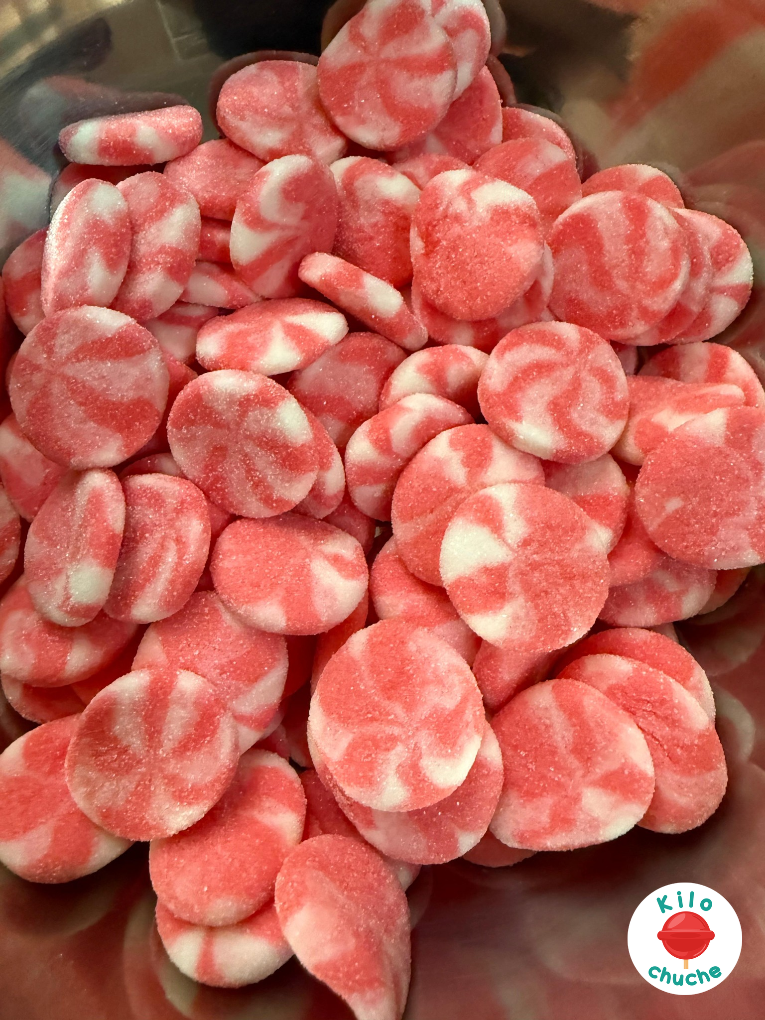 Ingredientes: Jarabe de glucosa, azúcar, agua, gelatina, acidulantes: E330, E296, E270, gelificante: pectina, aromas, colorantes: E129, E516. Halal.