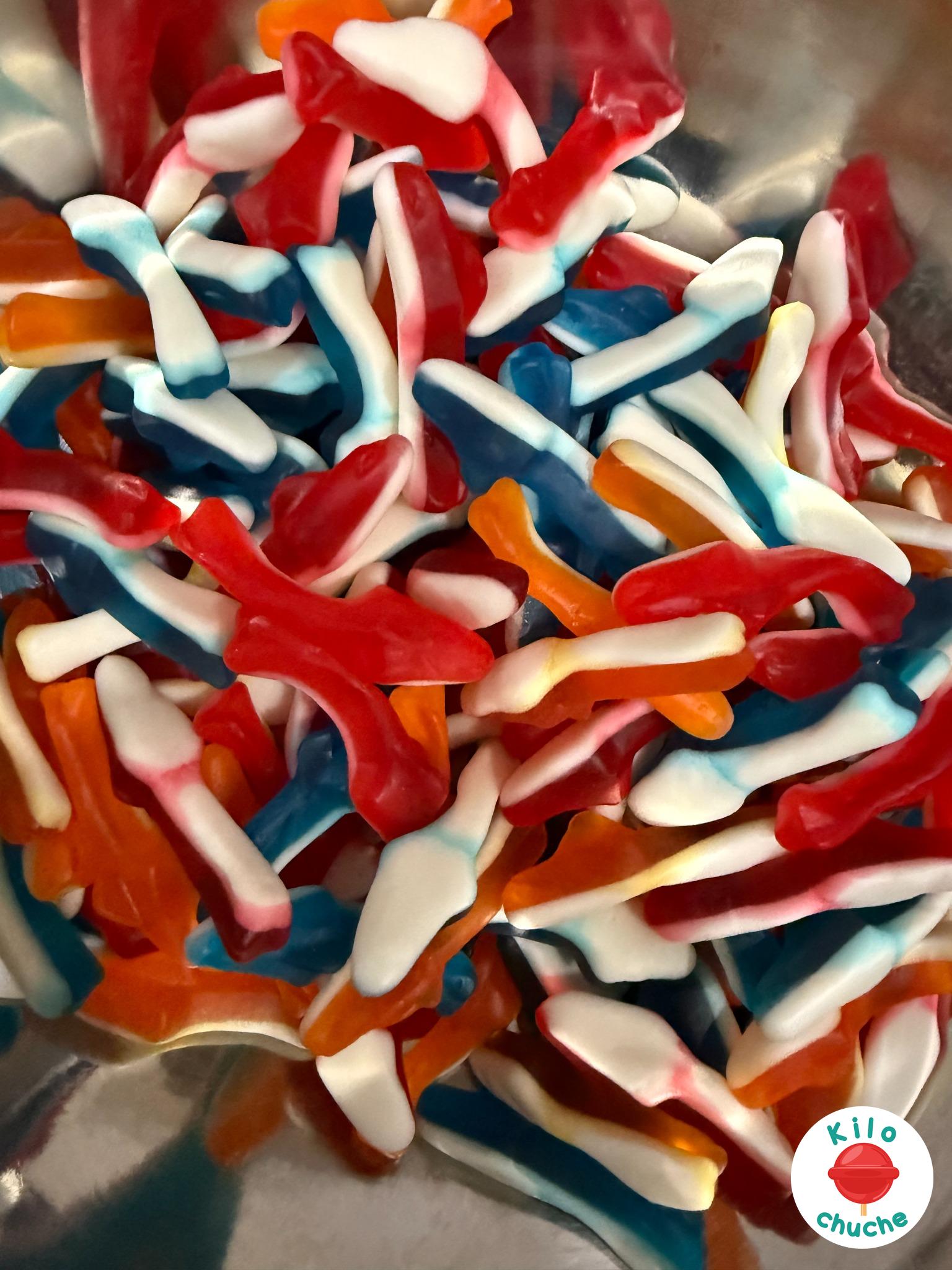 Ingredientes: Jarabe de glucosa, azúcar, agua, almidón modificado de patata, gelatina, acidulantes E330 E296 E270, aromas, colorantes, aceite vegetal (palma) y agente de recubrimiento: cera de carnauba. Halal.