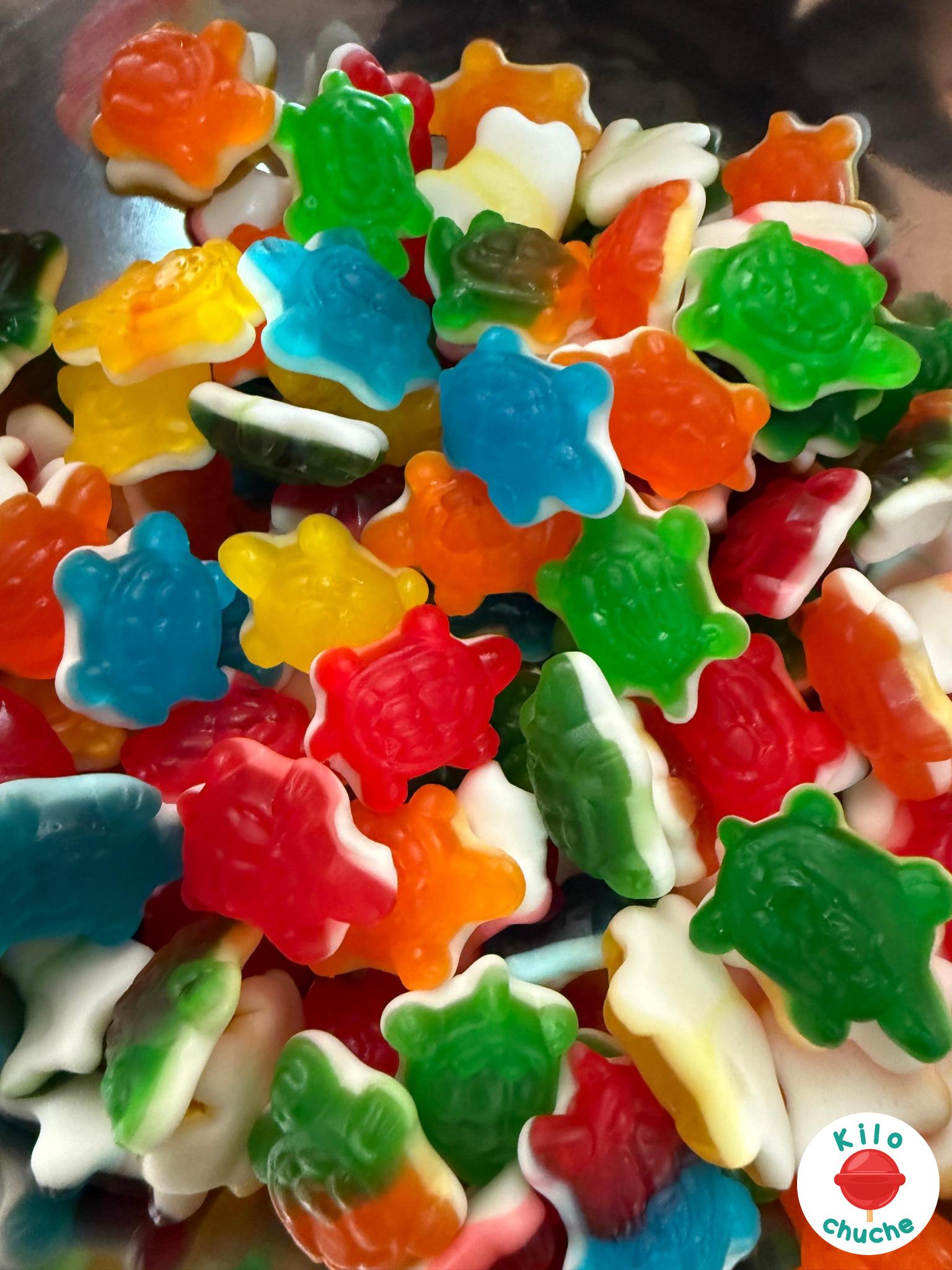 Ingredientes: Jarabe de glucosa, azúcar, gelatina, agua, humectante (E420), acidulantes (E330, E270), corrector de acidez (E325), aroma, agentes de recubrimiento (E901, E903), colorantes y/o concentrados: E102, E110, E129, E133.