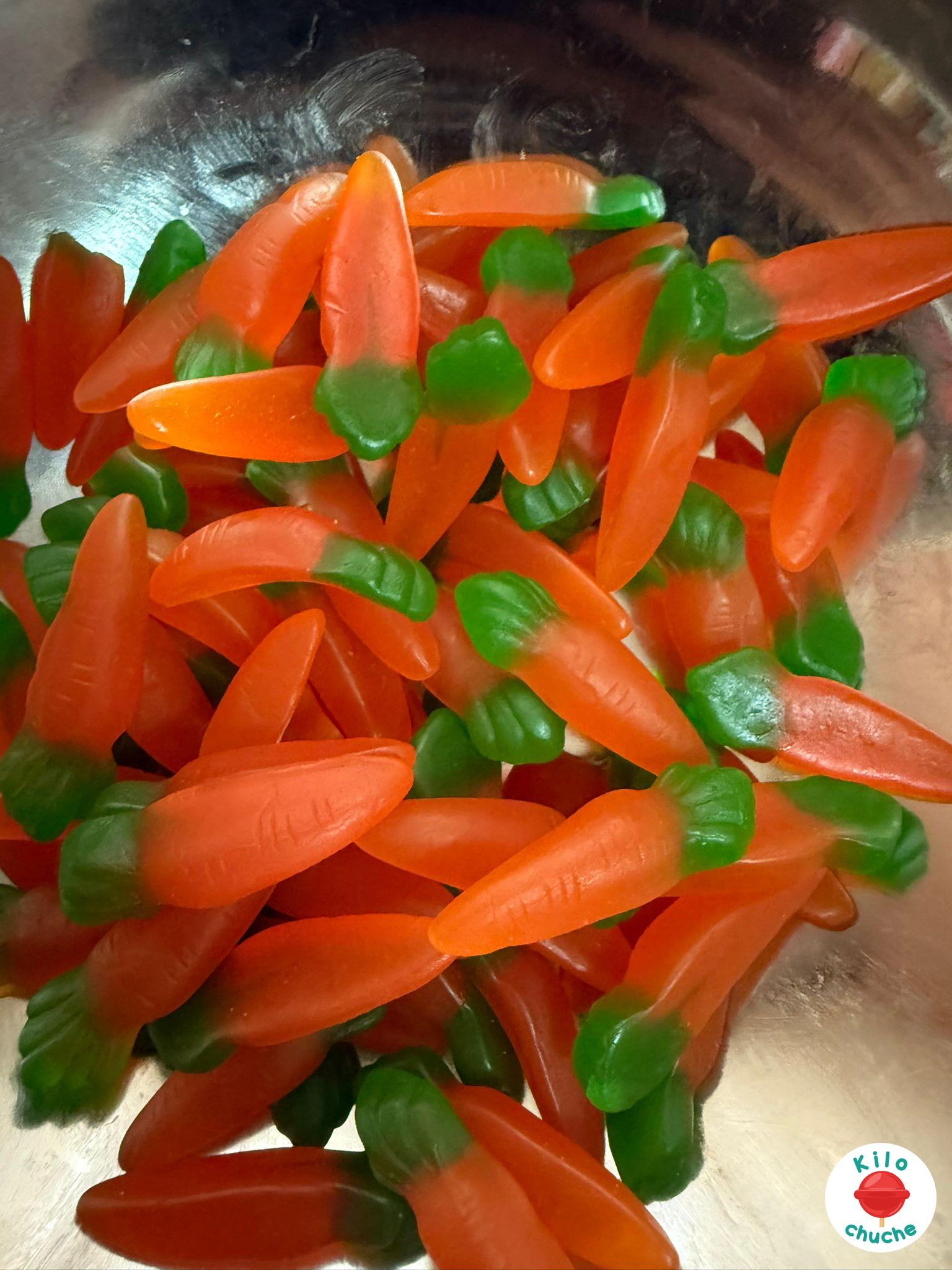 Ingredientes: jarabe de glucosa, azúcar, agua, almidón modificado de patata, gelatina, acidulantes E330, E296, E270, aromas, colorantes E102 E129 E133 E516, aceite vegetal (palma), agente de recubrimiento cera de carnauba. Halal.